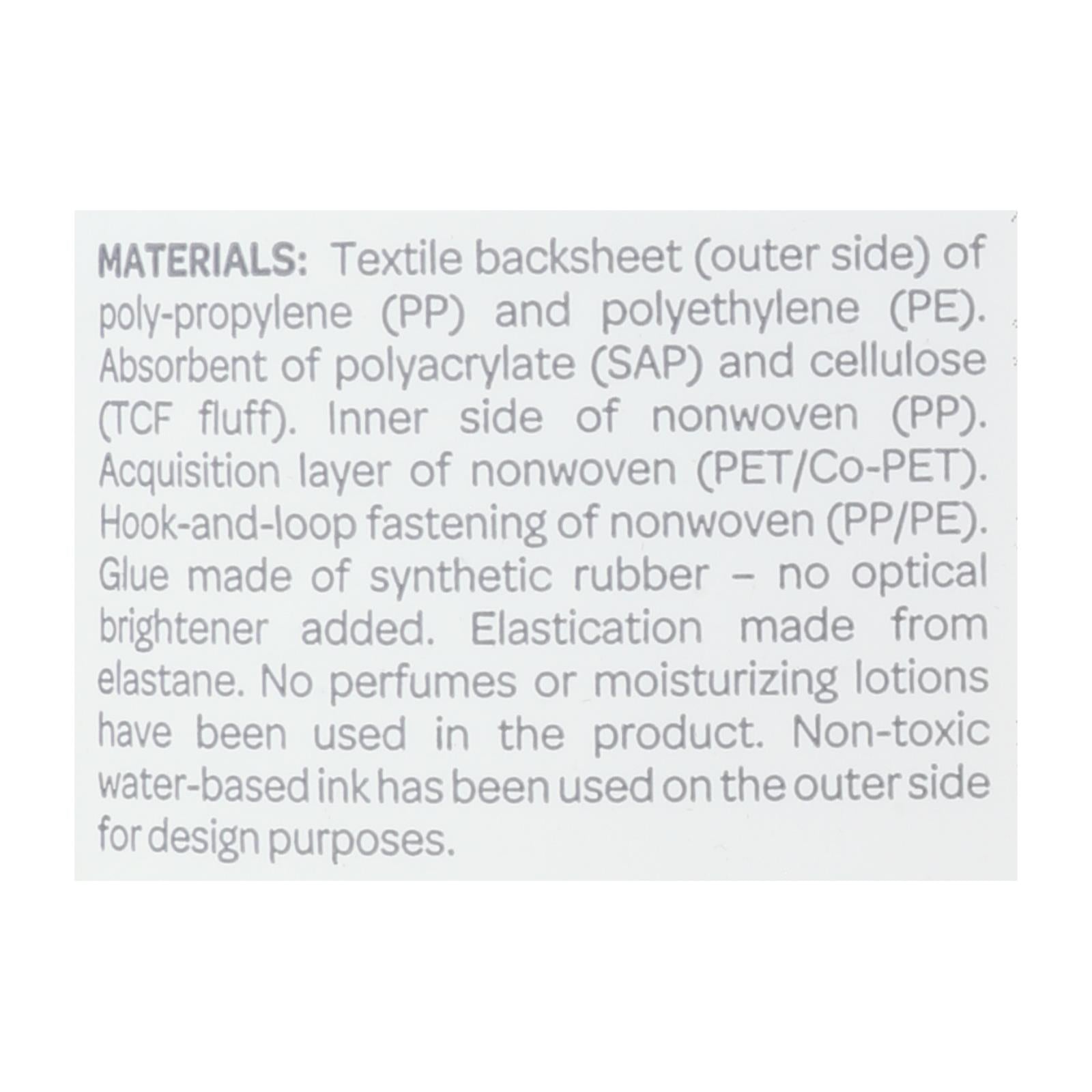 ingredients : textile backsheet (outer side) of poly-propylene (pp) and polyethylene (pe);absorbent of polyacrylate (sap) and cellulose (tcf fluff);inner side of nonwoven (pp);acquisition layer of nonwoven (pet/co-pet);hook-and-loop fastening of nonwoven (pp/pe);glue made of synthetic rubber - no optical brightener added;elastication made from elastane;no perfumes or moisturizing lotions have been used in the product;non-toxic water-based ink has been used on the outer side for design purposes