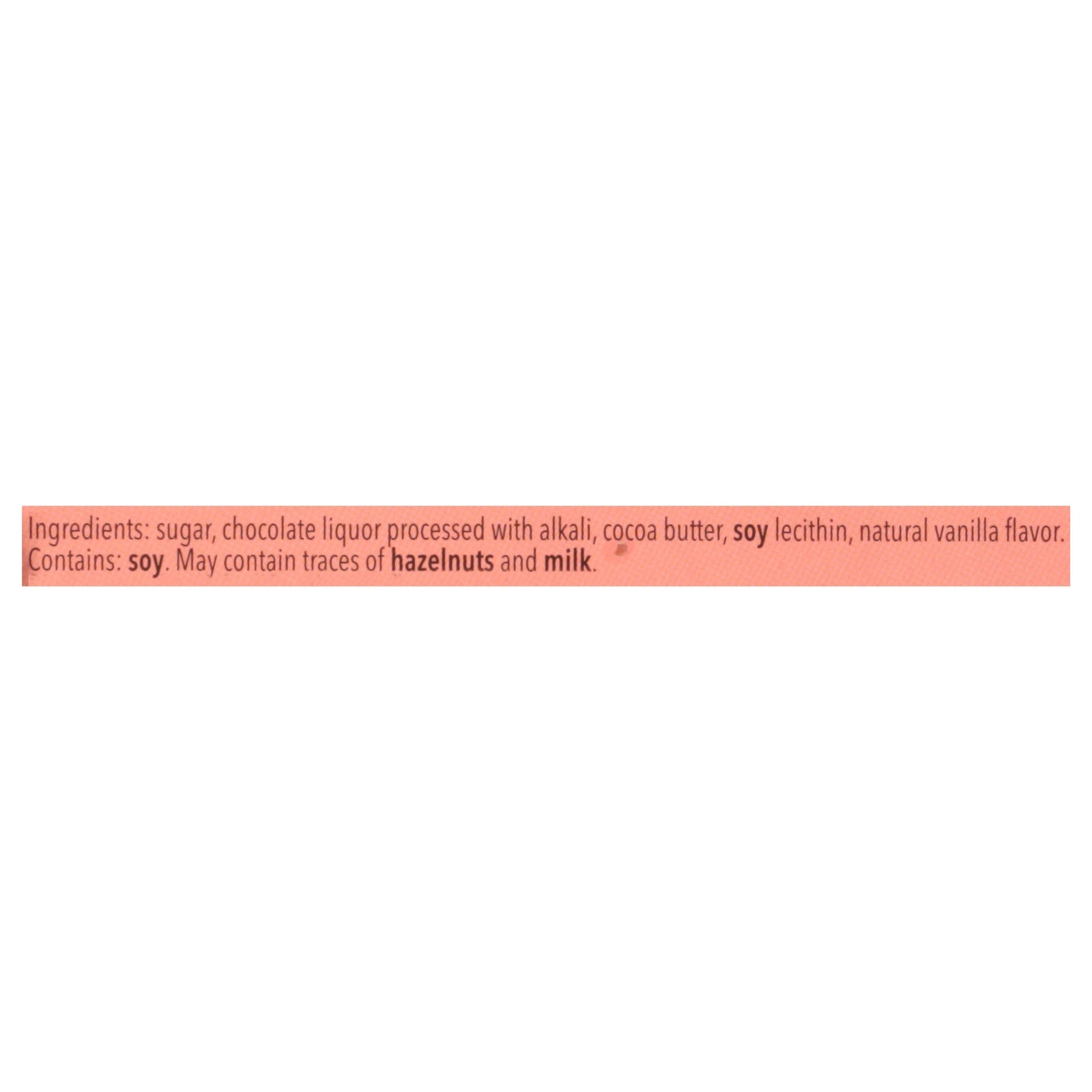 ingredients : sugar;chocolate liquor processed with alkali;cocoa butter;soy lecithin;natural vanilla flavor