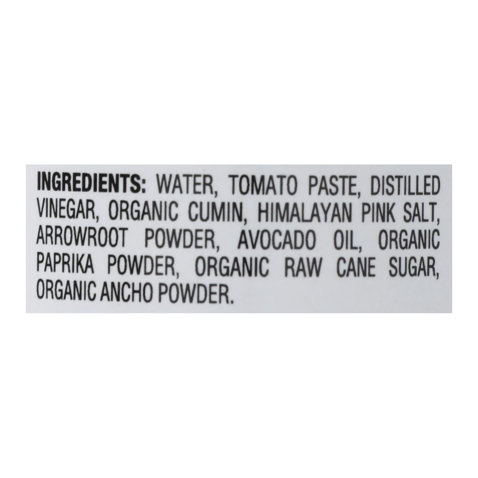 ingredients : water;tomato paste;distilled vinegar;cumin;himalayan pink salt;arrowroot powder;avocado oil;paprika;organic raw cane sugar;ancho powder