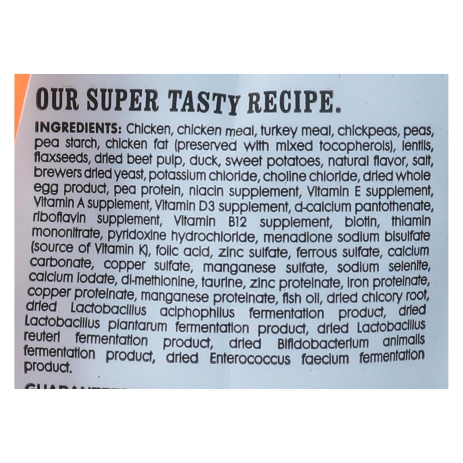 ingredients : chicken;chicken meal;turkey meal;chickpeas;peas;pea starch;chicken fat;preserved with mixed tocopherols;lentils;flaxseeds;dried beet pulp;duck;sweet potatoes;natural flavor;salt;brewers dried yeast;potassium chloride;choline chloride;dried whole egg product;pea protein;niacin supplement;vitamin e supplement;vitamin a supplement;vitamin d3 supplement;d-calcium pantothenate;riboflavin supplement;vitamin b12 supplement;biotin;thiamin mononitrate;pyridoxine hydrochloride;menadione sodium bisulfate;s