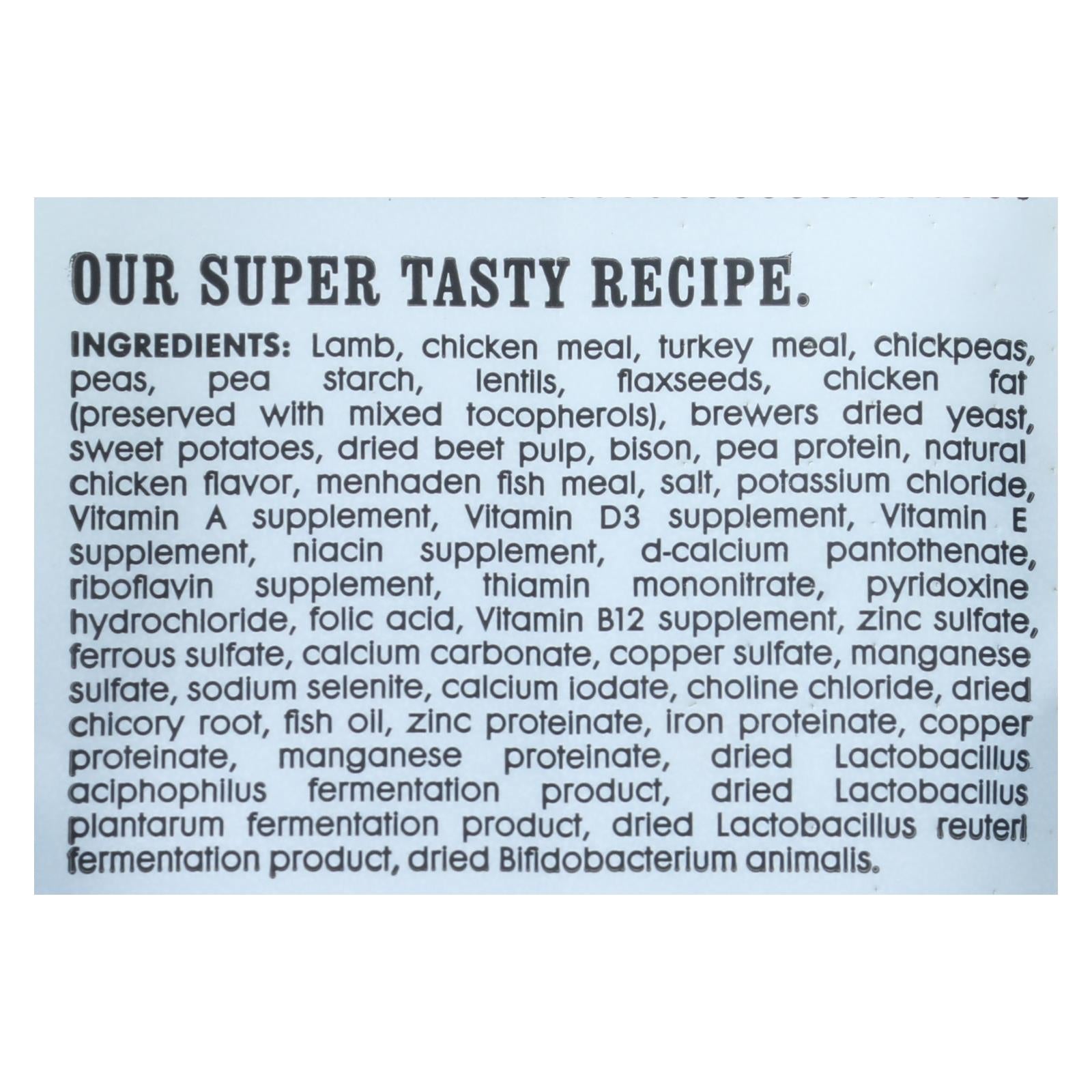 ingredients : lamb;chicken meal;turkey meal;chickpeas;peas;pea starch;lentils;flaxseeds;chicken fat;preserved with mixed tocopherols;brewers dried yeast;sweet potatoes;dried beet pulp;bison;pea protein;natural chicken flavor;menhaden fish meal;salt;potassium chloride;vitamin a supplement;vitamin d3 supplement;vitamin e supplement;niacin supplement;d-calcium pantothenate;riboflavin supplement;thiamin mononitrate;pyridoxine hydrochloride;folic acid;vitamin b12 supplement;zinc sulfate;ferrous sulfate;calcium car