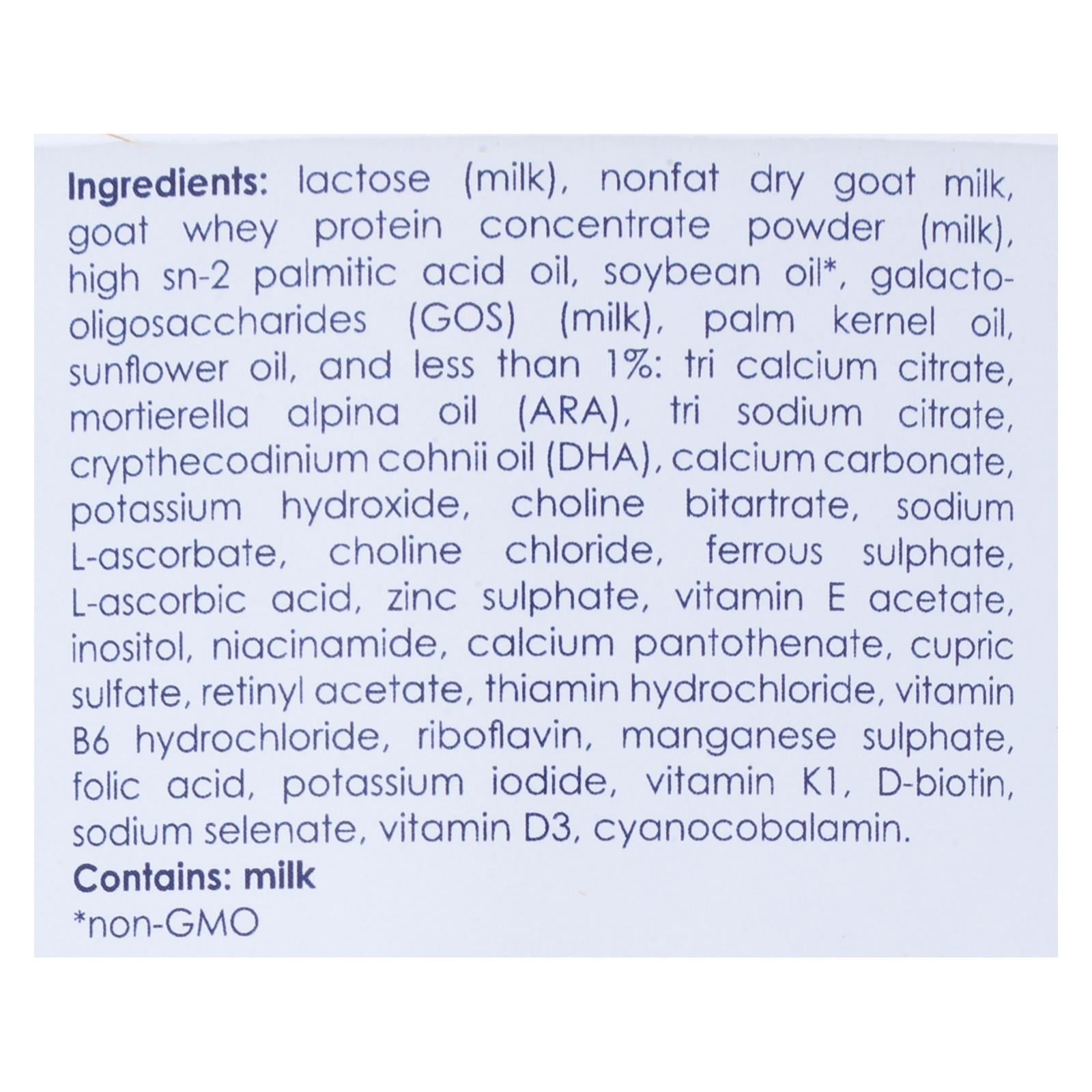 ingredients : lactose;milk;nonfat dry goat milk;goat whey protein concentrate powder;high sn-2 palmitic acid oil;soybean oil;galacto-oligosaccharides;gos;palm kernel oil;sunflower oil;and less than 1%: tri calcium citrate;mortierella alpina oil;ara;tri sodium citrate;crypthecodinium cohnii oil;dha;calcium carbonate;potassium hydroxide;choline bitartrate;sodium l-ascorbate;choline chloride;ferrous sulphate. L-ascorbic acid;zinc sulphate;vitamin e acetate;inositol;niacinamide;calcium pantothenate;cupric sulfate