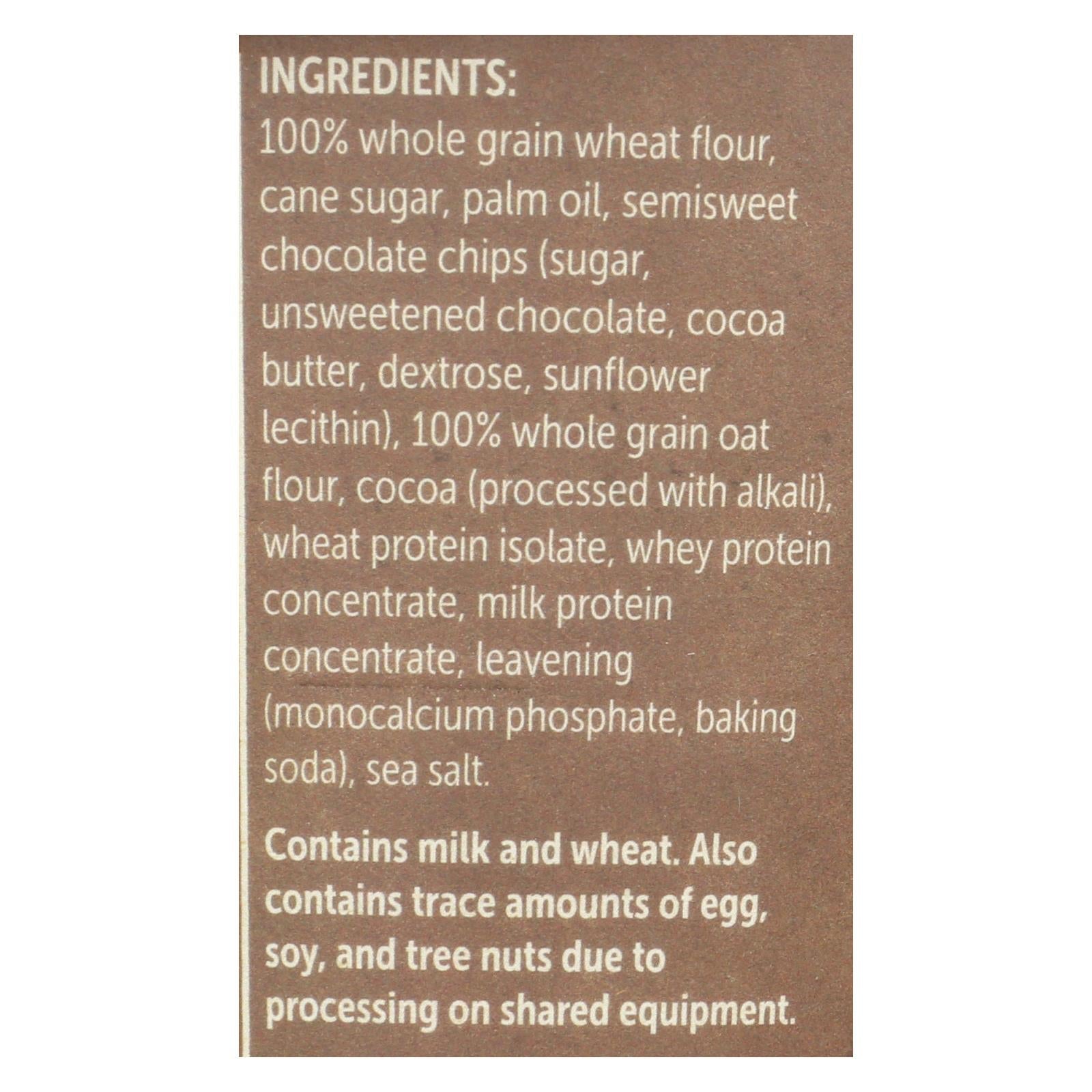 ingredients : 100% whole grain wheat flour;cane sugar;palm oil;semisweet chocolate chips;sugar;unsweetened chocolate;cocoa butter;dextrose;sunflower lecithin;100% whole grain oat flour;cocoa;processed with alkali;wheat protein isolate;whey protein concentrate;milk protein concentrate;leavening;monocalcium phosphate;baking soda;sea salt