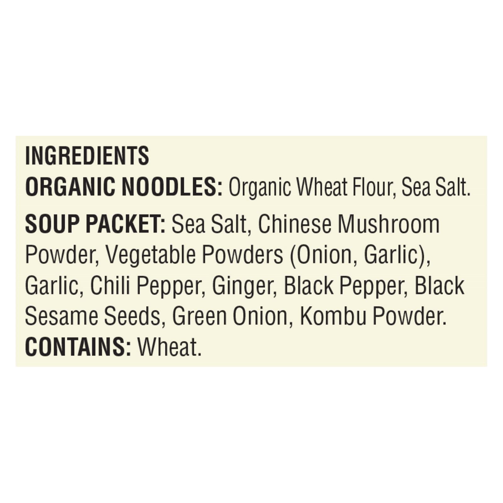 ingredients : organic noodles: organic wheat flour, sea salt;soup packet: sea salt, chinese mushroom powder, onion & garlic powder, garlic, chili pepper, ginger, black pepper, black sesame seeds, green onion, kombu powder