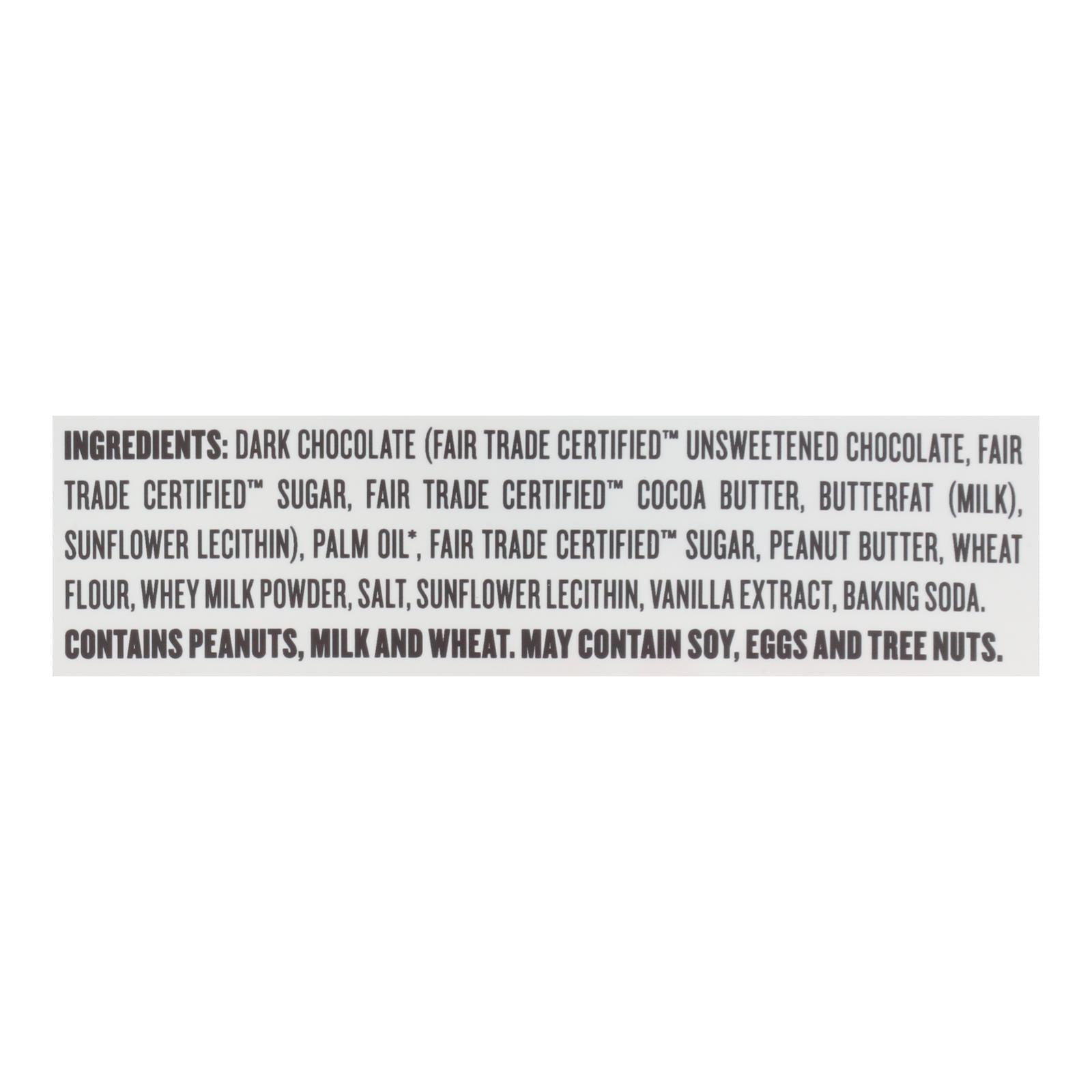 ingredients : dark chocolate (fair trade certified™ unsweetened chocolate, fair trade certified™ sugar, fair trade certified™ cocoa butter, butterfat (milk), sunflower lecithin);palm oil;fair trade certified™ sugar;peanut butter;wheat flour;whey milk powder;salt;sunflower lecithin;vanilla extract;baking soda