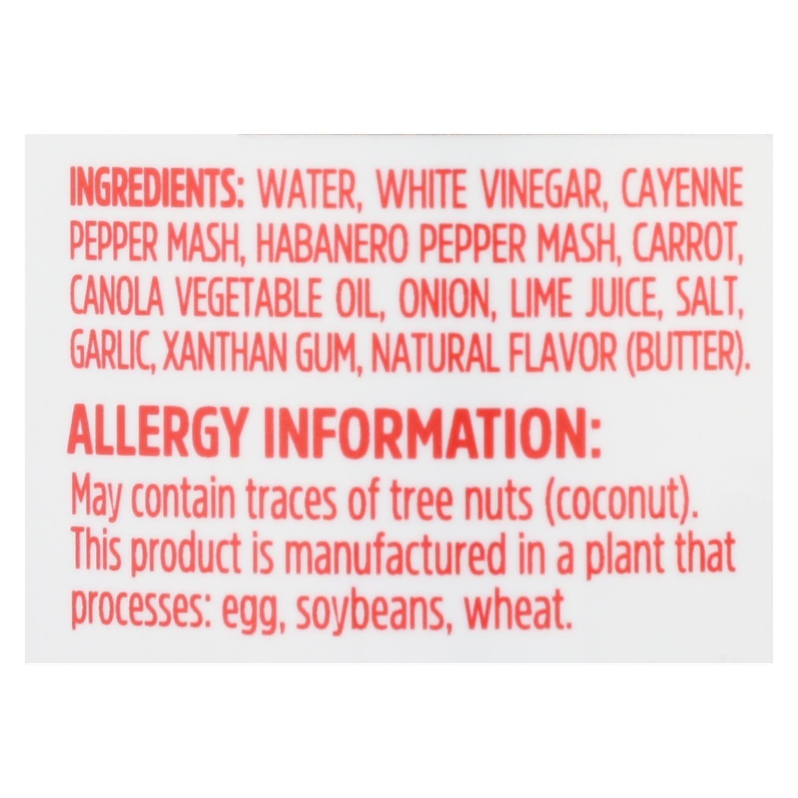ingredients : water;white vinegar;cayenne pepper mash;habanero pepper mash;carrot;canola vegetable oil;onion;lime juice;salt;garlic;xanthan gum;natural flavor;butter