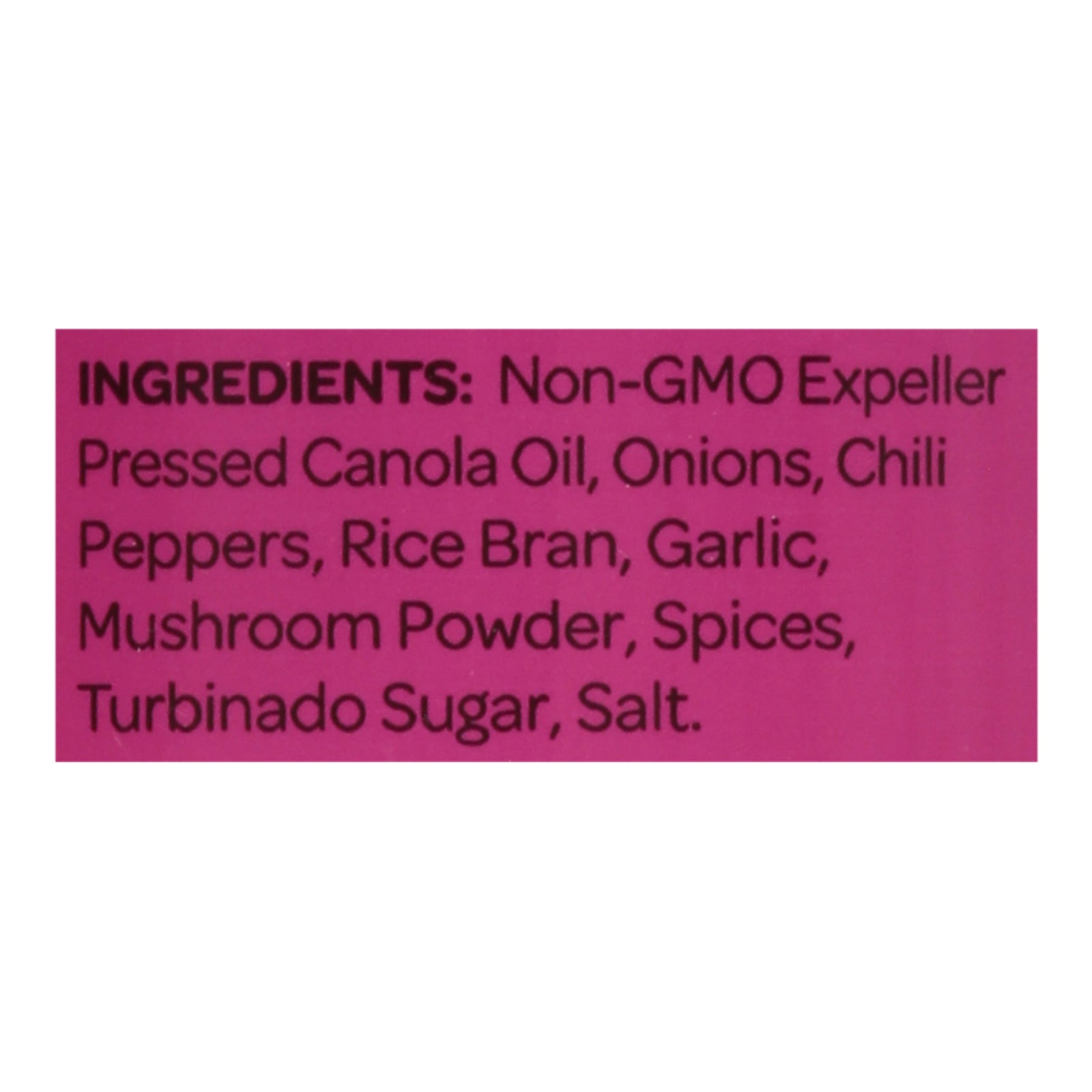 ingredients : non-gmo expeller pressed canola oil;onions;chili peppers;rice bran;garlic;mushroom powder;spices;turbinado sugar;salt