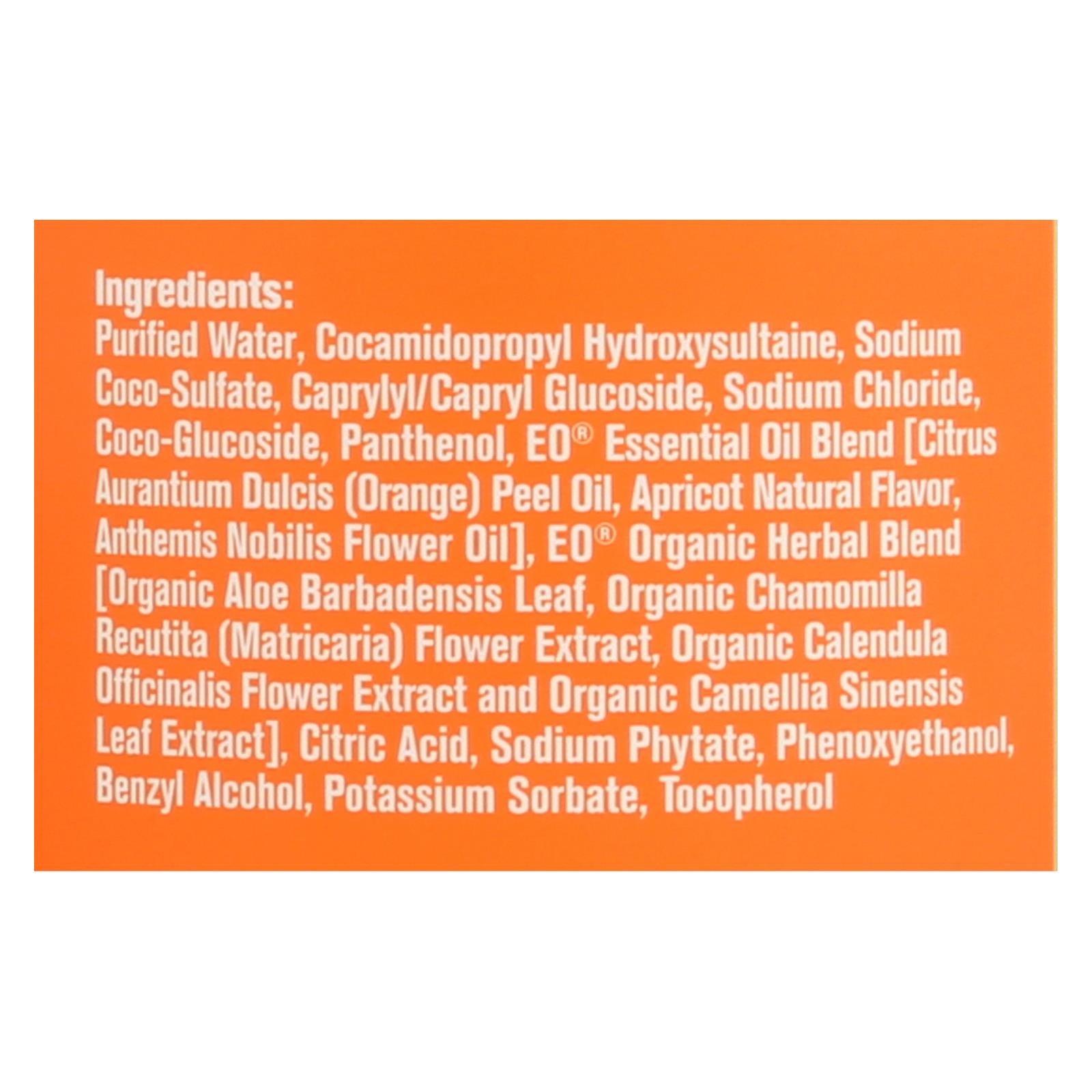 ingredients : purified water;cocamidopropyl hydroxysultaine;sodium coco-sulfate;caprylyl/capryl glucoside;sodium chloride;coco-glucoside;panthenol;eo® essential oil blend [citrus aurantium dulcis;orange;peel oil;apricot natural flavor;anthemis nobilis flower oil];eo® organic herbal blend [organic aloe barbadensis leaf;organic chamomilla recutita;matricaria;flower extract;organic calendula officinalis flower extract and organic camellia sinensis leaf extract];citric acid;sodium phytate;phenoxyethanol;benzyl al