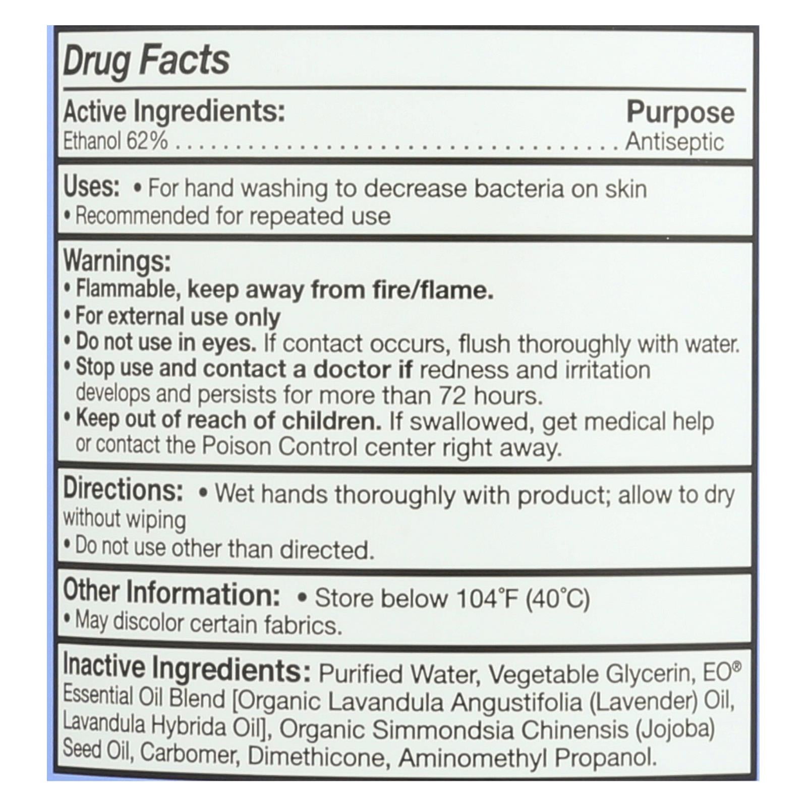 ingredients : water;glycerin;lavandula angustifolia (lavender) oil;lavandula hybrida oil;simmondsia chinensis (jojoba) seed oil;carbomer;dimethicone;aminomethyl propanol;ethanol 62% purpose antiseptic