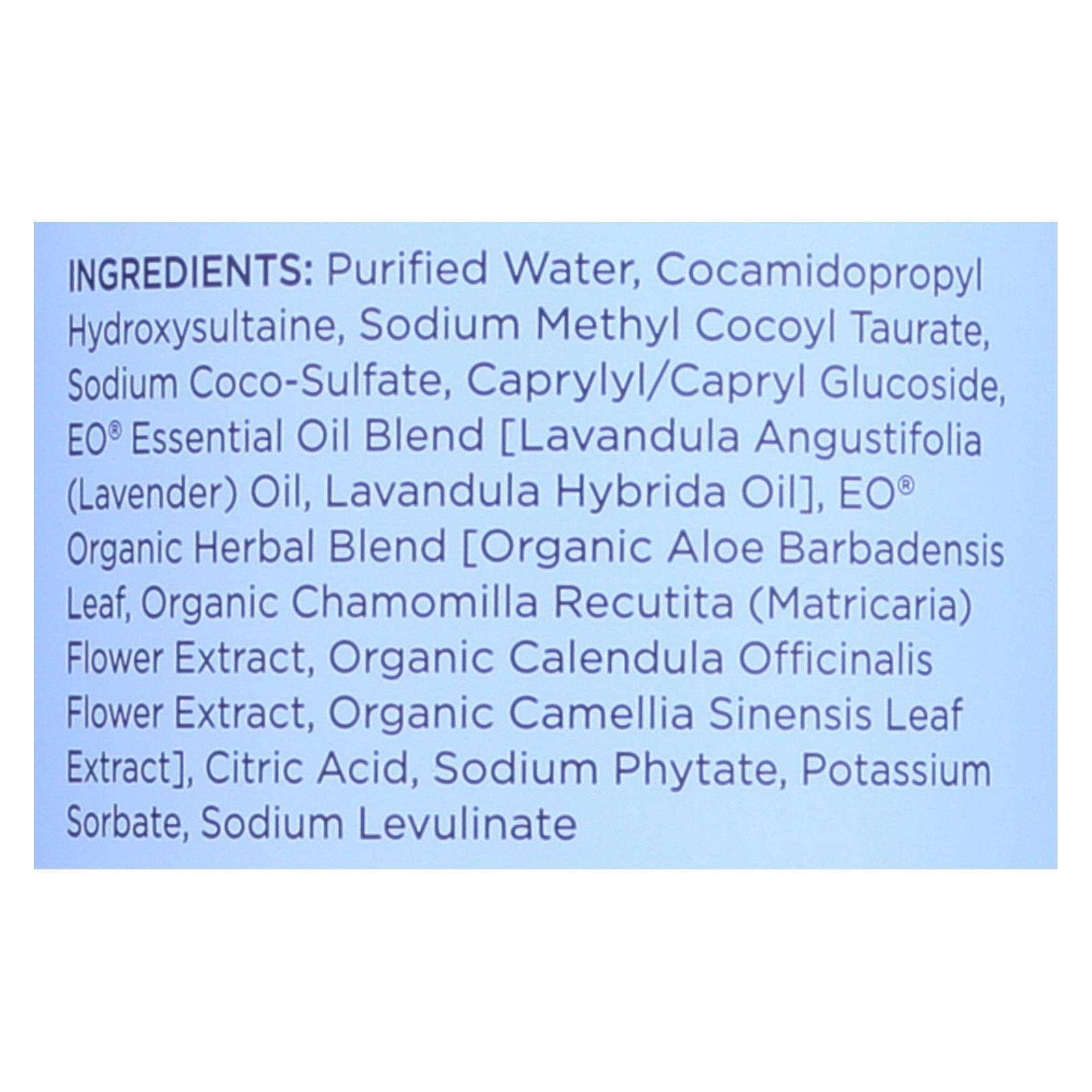 ingredients : purified water;cocamidopropyl hydroxysultaine;sodium methyl cocoyl taurate;sodium coco-sulfate;caprylyl/capryl glucoside;eo® essential oil blend [lavandula angustifolia;lavender;oil;lavandula hybrida oil];eo® organic herbal blend [organic aloe barbadensis leaf;organic chamomilla recutita;matricaria;flower extract;organic calendula officinalis flower extract;organic camellia sinensis leaf extract];citric acid;sodium phytate;potassium sorbate;sodium levulinate