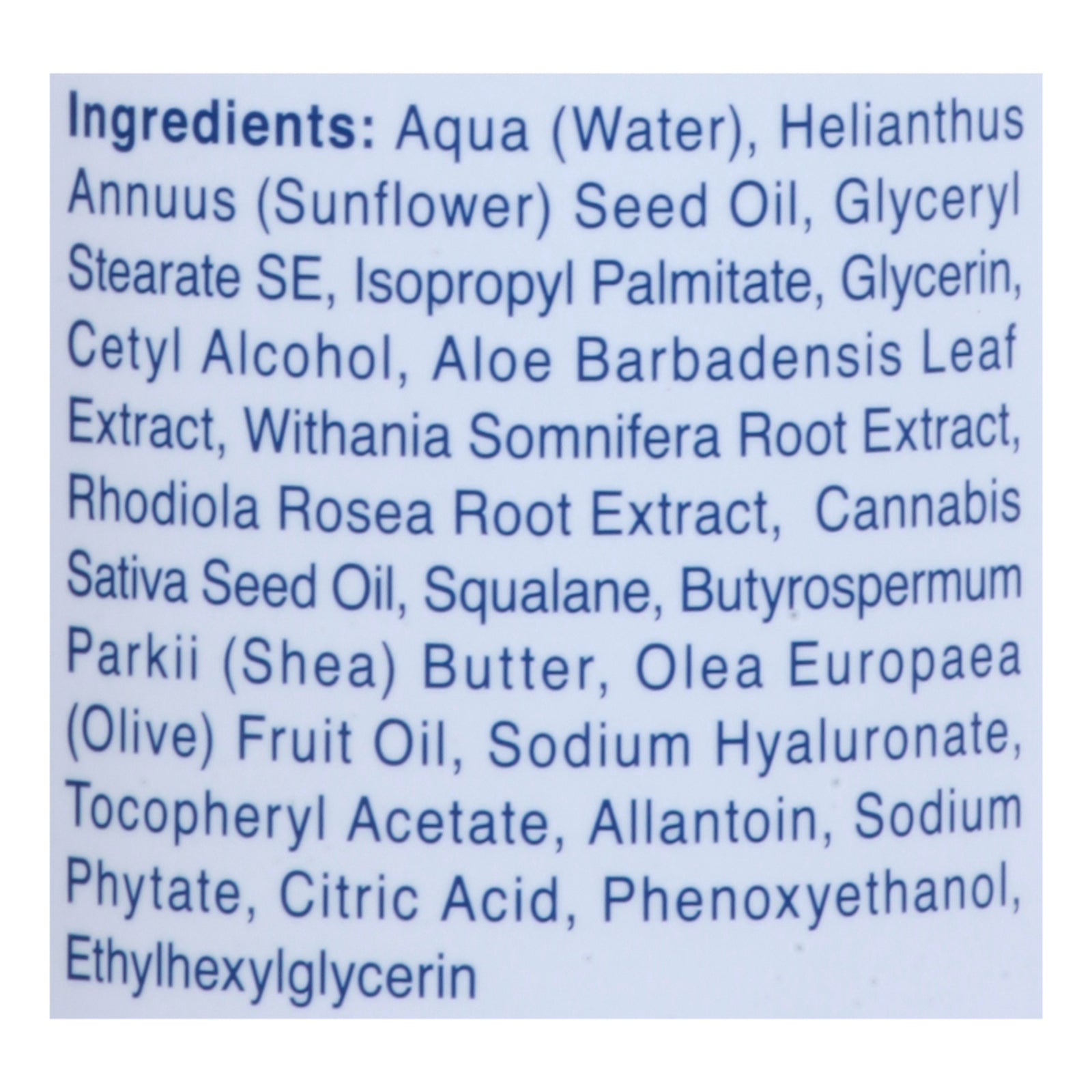 ingredients : aqua (water);helianthus annuus (sunflower) seed oil;glyceryl stearate se;isopropyl palmitate;glycerin;cetyl alcohol;aloe barbadensis leaf extract;withania somnifera root extract;rhodiola rosea root extract;cannabis sativa seed oil;squalane;butyrospermum parkii (shea) butter;olea europaea (olive) fruit oil;sodium hyaluronate;tocopheryl acetate;allantoin;sodium phytate;citric acid;phenoxyethanol;ethylhexylglycerin