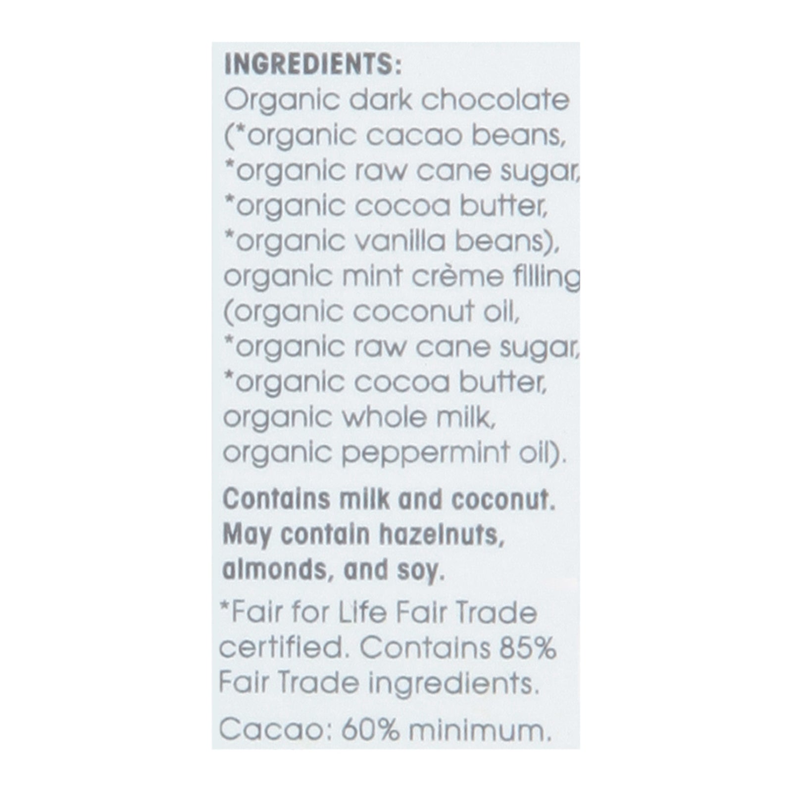 ingredients : organic dark chocolate (*organic cacao beans, *organic raw cane sugar, *organic cocoa butter, *organic vanilla beans);organic mint cr me filling (organic coconut oil, *organic raw cane sugar, *organic cocoa butter, organic whole milk, organic peppermint oil)
