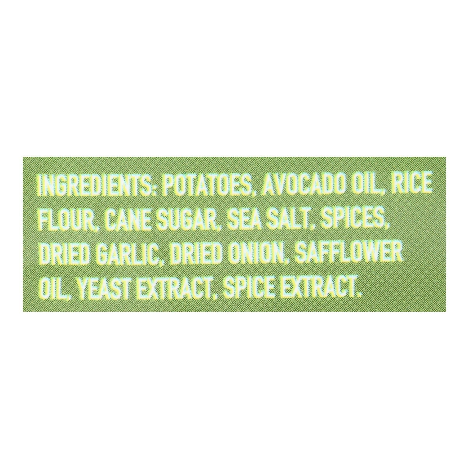 ingredients : potatoes;avocado oil;rice flour;cane sugar;sea salt;spices;dried garlic;dried onion;safflower oil;yeast extract;spice extract