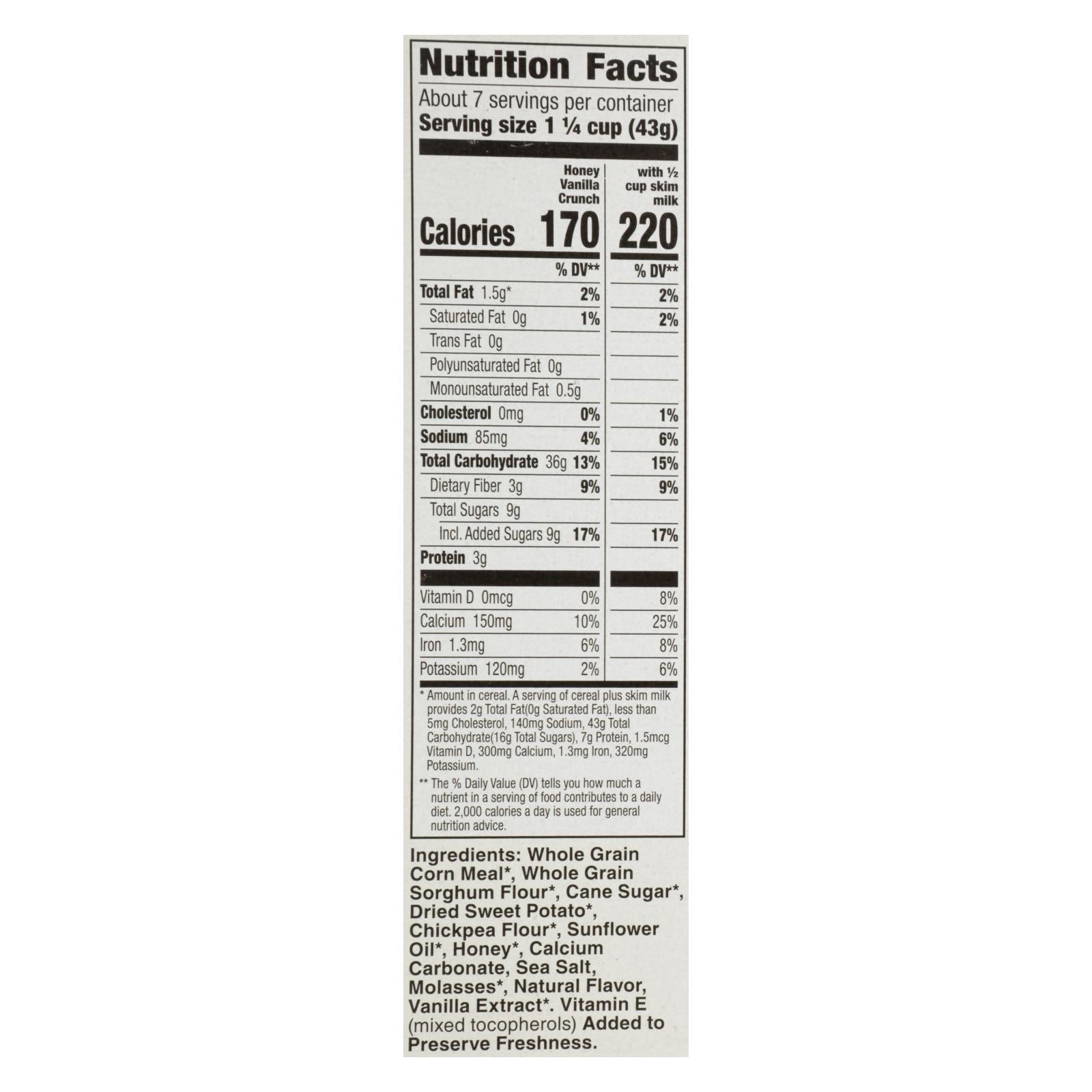 Organic whole grain corn, sorghum, sweet potato and chickpea. Honey vanilla crunch flavored with other natural flavors. Gluten free. Usda organic. Otco certified organic by oregon tilth. 26 g whole grain per serving. At least 48 g recommended daily. Non gmo project verified. Nongmoproject.org. Founded in skagit valley, wa. Cascadian farm. The farmland. Join us in restoring 25 million sq. Ft. Cascading change with the nature conservancy turn over to learn more. As one of the earliest pioneers of organic agriculture, we have spent more than 40 years working to protect our planet through actions like planting pollinator habitats, helping farmers build healthy soil, and integrating climate-smart crops into our products. But there is much more work to be done. Step-by-step, we are reimagining the relationship between food, farmland, nature & communities, seeking to drive and inspire meaningful change along the way. This package is sold by weight, not by volume. You can be assured of proper weight even though some settling of contents normally occurs during shipment and handling. Www.cascadianfarm.com. How2recycle.info. We welcome your questions or comments. 1-800-624-4123. Visit us at www.cascadianfarm.com. Box top for education: no more clipping. Scan your receipt. See how at btfe.com. Certified 100% recycled paperboard. Creating a wave of cascading change. Our mission is to create cascading change to help protect our planet - because small steps can lead to great impact. Our journey has taken us to the critical foodshed of the sacramento valley, ca. We're partnering with the nature conservancy to protect natural resources like wildlife habitat and groundwater to help farms become more resilient. After all, farms encompass more than just the land at our feet - they include a rich ecosystem above and below ground. By choosing cascadian farm, you show support for our commitments to projects like these - in this case, our donation of $750,000 to help build resilience across more than 600 acres, 1 sq ft at a time. Join us in cascading change. Learn more at cascadianfarm.com. Cascadian farm is committing $750,000 to our partners at the nature conservancy whose mission is 'to protect the lands and waters on which all life depends (www.nature.org). Over the course of 12/2020-12/2022, our contribution will help rebuild wildlife habitat and regenerate groundwater on over 600 acres of farmland in the sacramento valley, ca. The goal is to restore health to the farm ecosystem, in turn making farming operations more resilient to threats like climate change. Donation to the conservancy not contingent upon purchase.