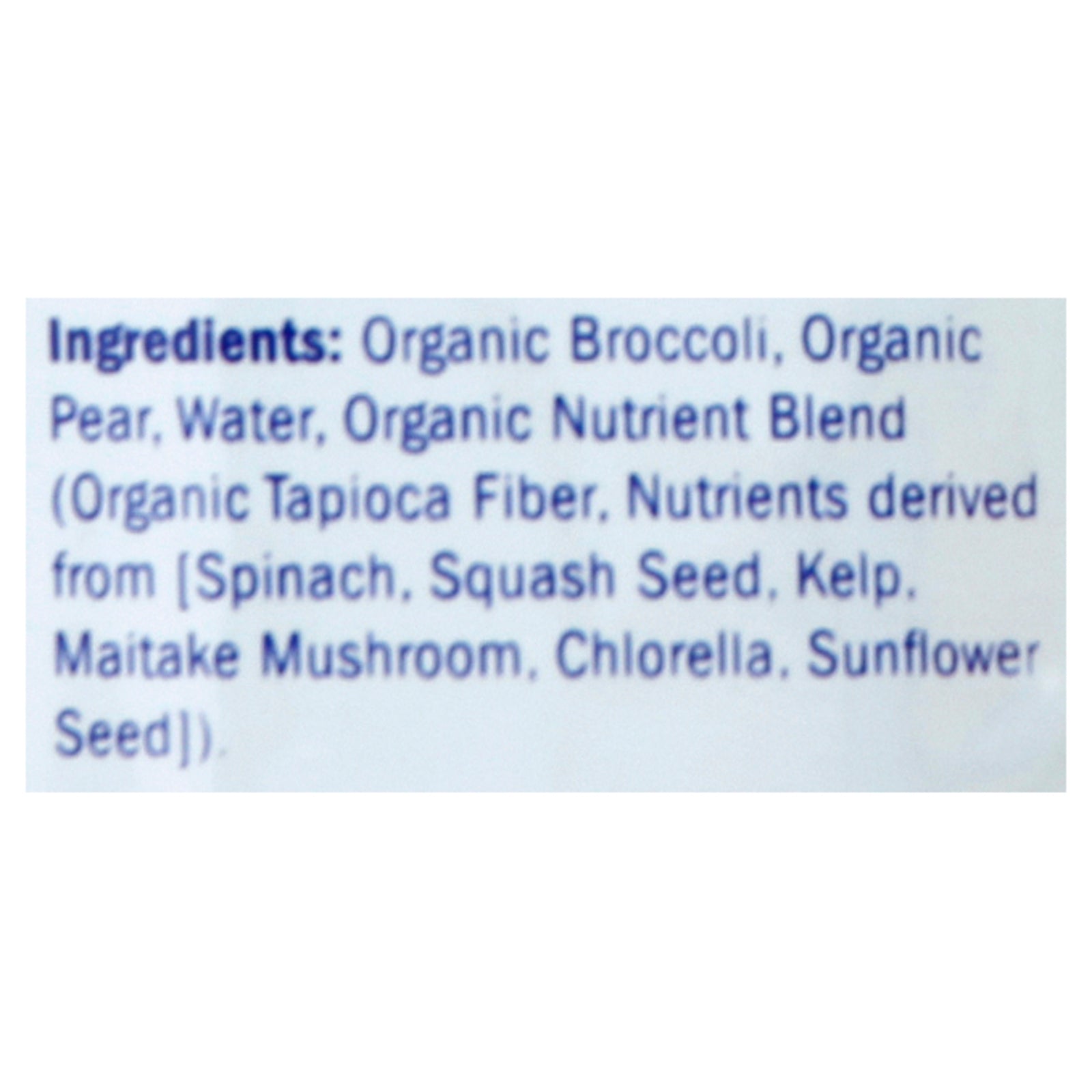ingredients : organic broccoli;organic pears;water;organic nutrient blend (organic tapioca fiber, nutrients derived from [spinach, broccoli, squash seeds, cranberries, maitake mushrooms, chlorella, sunflower seeds])