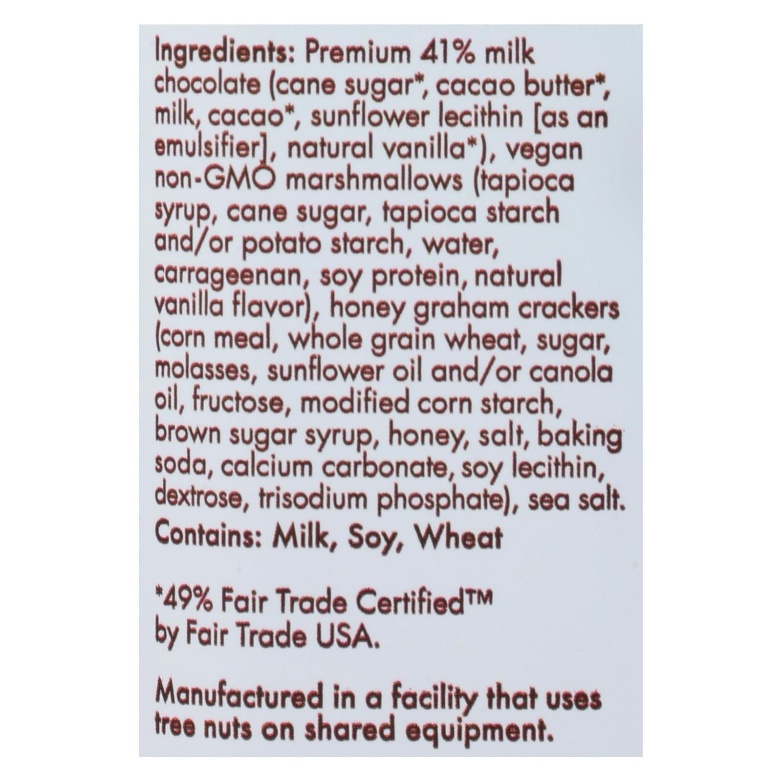 ingredients : premium 41% milk chocolate;cane sugar;cacao butter;milk;cacao;sunflower lecithin [as an emulsifier];natural vanilla;vegan non-gmo marshmallows;tapioca syrup;tapioca starch and/or potato starch;water;carrageenan;soy protein;natural vanilla flavor;honey graham crackers;corn meal;whole grain wheat;sugar;molasses;sunflower oil and/or canola oil;fructose;modified corn starch;brown sugar syrup;honey;salt;baking soda;calcium carbonate;soy lecithin;dextrose;trisodium phosphate;sea salt
