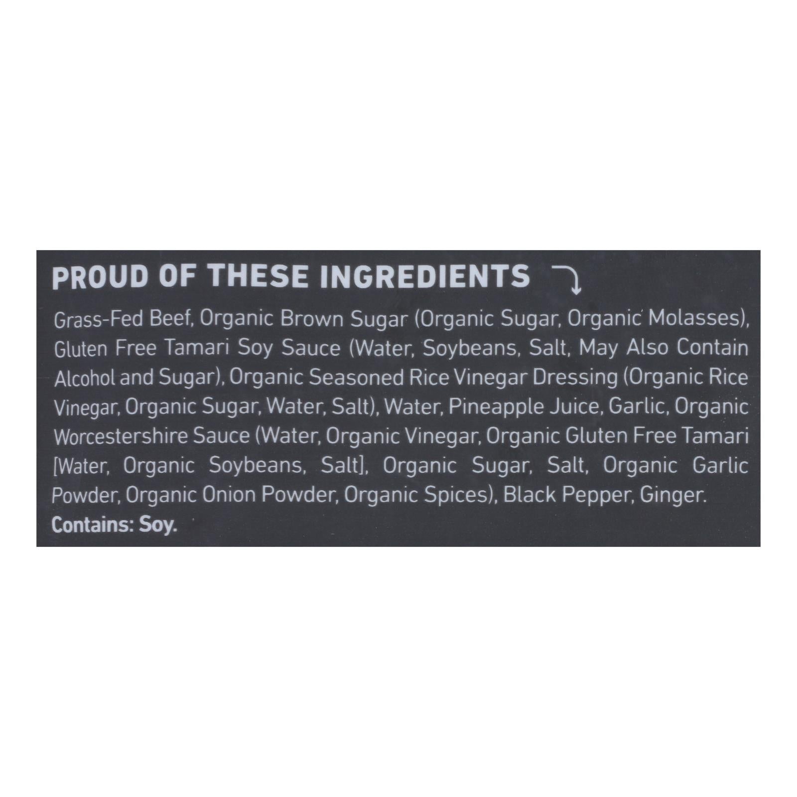 ingredients : grass-fed beef;organic brown sugar;organic sugar;organic molasses;gluten free tamari soy sauce;water;soybeans;salt;may also contain alcohol and sugar;organic seasoned rice vinegar dressing;organic rice vinegar;pineapple juice;garlic;organic worcestershire sauce;organic vinegar;organic gluten free tamari [water;organic soybeans;organic garlic powder;organic onion powder;organic spices;black pepper;ginger