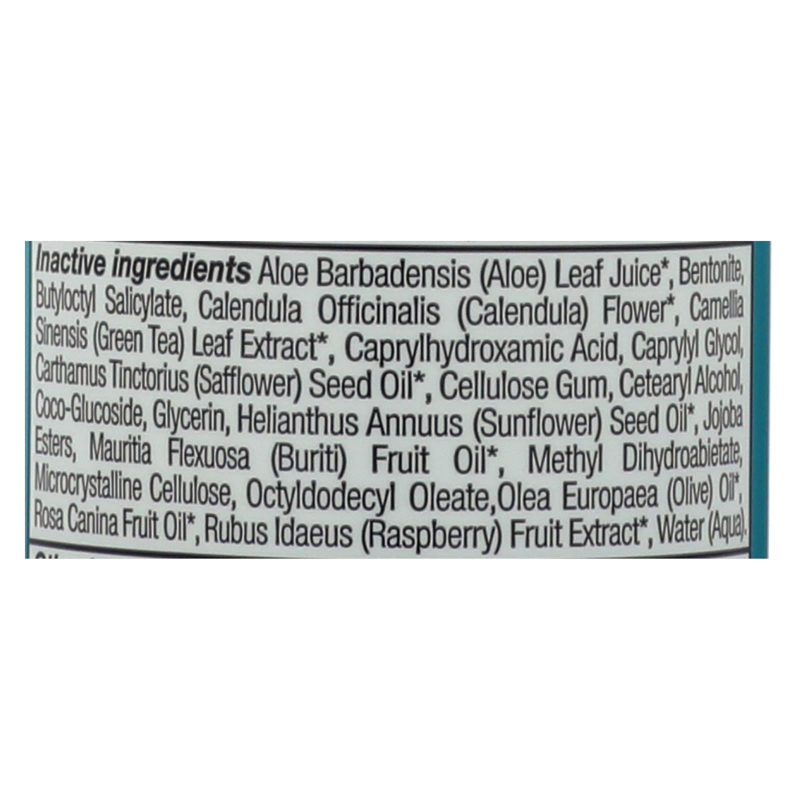 ingredients : aloe barbadensis;aloe;leaf juice;bentonite;butyloctyl salicylate;calendula officinalis;calendula;flower;camellia sinensis;green tea;leaf extract;caprylhydroxamic acid;caprylyl glycol;carthamus tinctorius;safflower;seed oil;cellulose gum;cetearyl alcohol;coco-glucoside;glycerin;helianthus annuus;sunflower;jojoba esters;mauritia flexuosa;buriti;fruit oil;methyl dihydroabietate;microcrystalline cellulose;octyldodecyl oleate;olea europaea;olive;oil;rosa canina fruit oil;rubus idaeus;raspberry;fruit