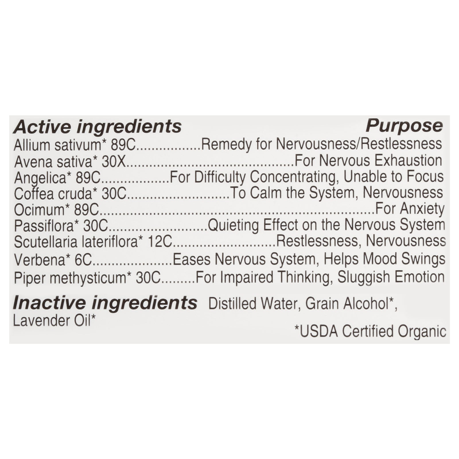 ingredients : distilled water;grain alcohol;lavender oil;allium sativum* 89c purpose remedy for nervousness/restlessness avena sativa* 30x purpose for nervous exhaustion angelica* 89c purpose for difficulty concentrating;unable to focus coffea cruda* 30c purpose to calm the system;nervousness ocimum* 89c purpose for anxiety passiflora* 30c purpose quieting effect on the nervous system scutellaria lateriflora* 12c purpose restlessness;nervousness verbena* 6c purpose eases nervous system;helps mood swings piper