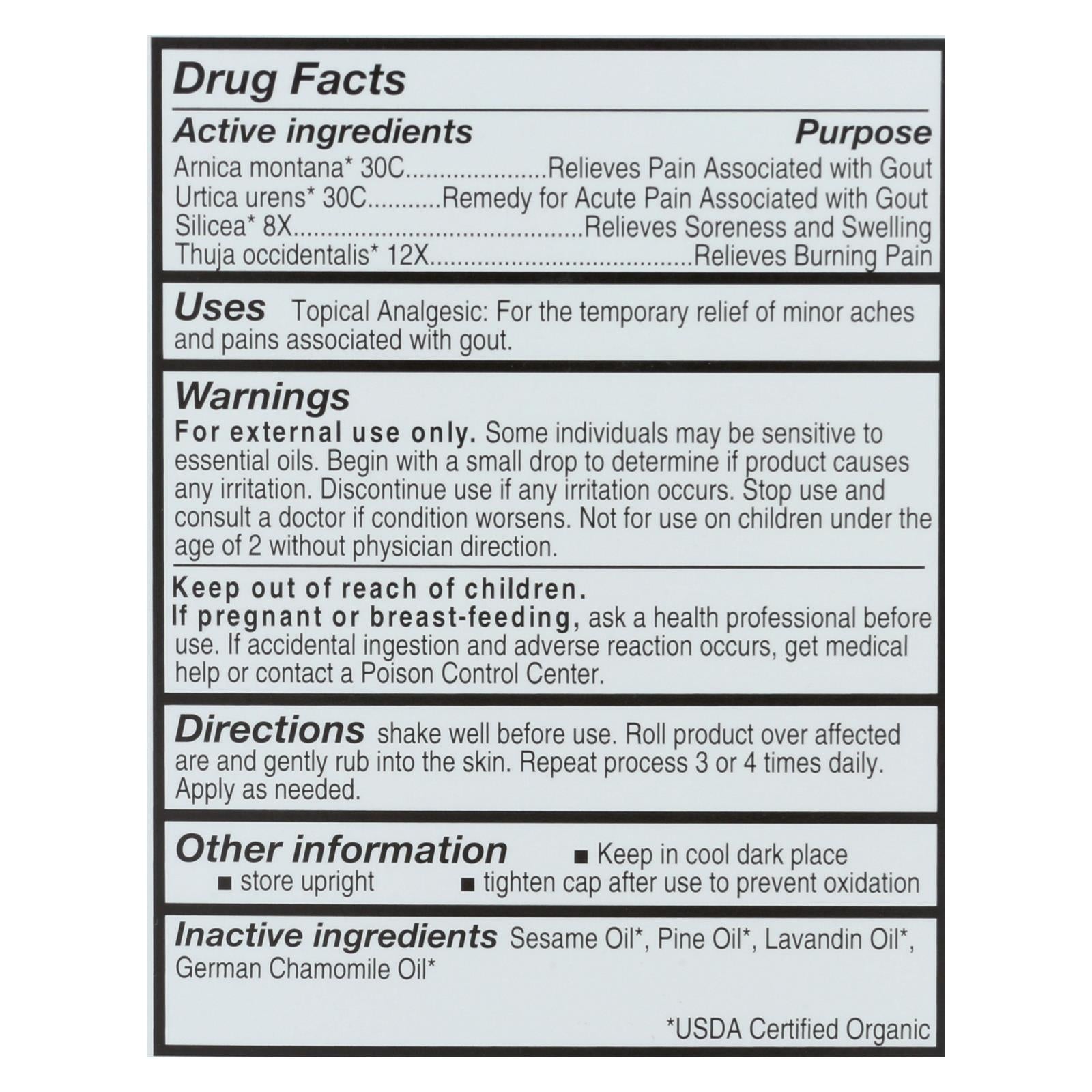 ingredients : arnica montana* 30c purpose relieves pain associated with gout urtica urens* 30c purpose remedy for acute pain associated with gout silicea* 8x purpose relieves soreness and swelling thuja occidentalis* 12x purpose relieves burning pain;sesame oil;pine oil;lavandin oil;german chamomile oil