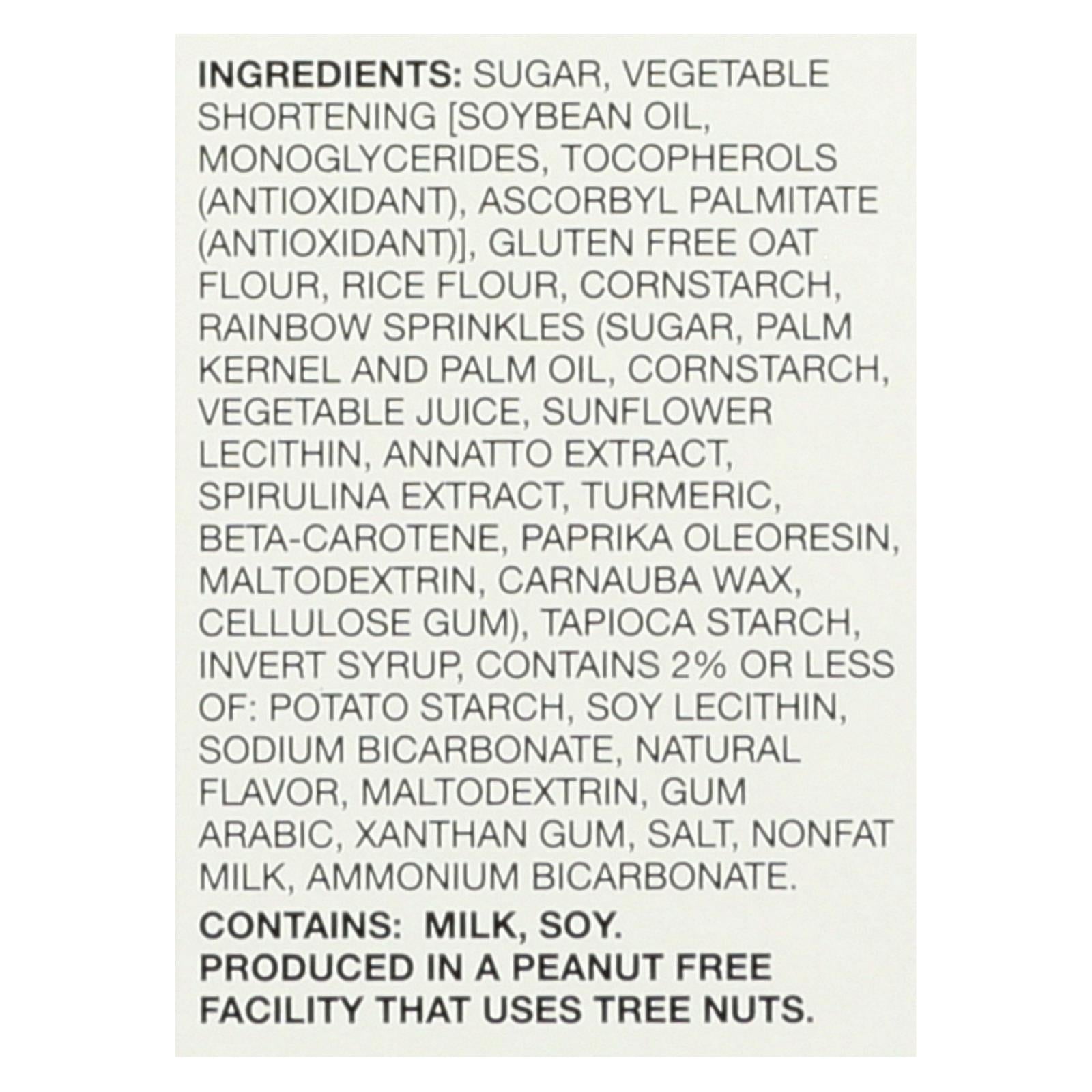 ingredients : sugar;vegetable shortening [soybean oil;monoglycerides;tocopherols;antioxidant;ascorbyl palmitate;];gluten free oat flour;rice flour;cornstarch;rainbow sprinkles;palm kernel and palm oil;vegetable juice;sunflower lecithin;annatto extract;spirulina extract;turmeric;beta-carotene;paprika oleoresin;maltodextrin;carnauba wax;cellulose gum;tapioca starch;invert syrup;contains 2% or less of: potato starch;soy lecithin;sodium bicarbonate;natural flavor;gum arabic;xanthan gum;salt;nonfat milk;ammoniumb