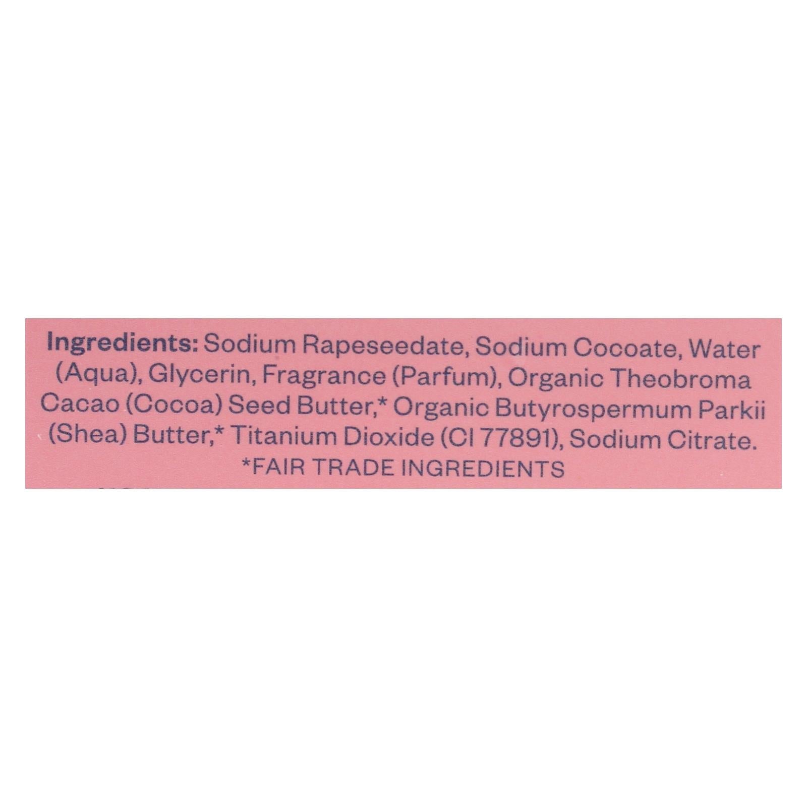 ingredients : sodium cocoate;water;glycerin;coconut acid;fragrance;titanium dioxide (ci 77891);sodium citrate;sodium gluconate;sodium chloride;organic theobroma cacao (cocoa) seed butter;organic butyrospermum parkii (shea) butter