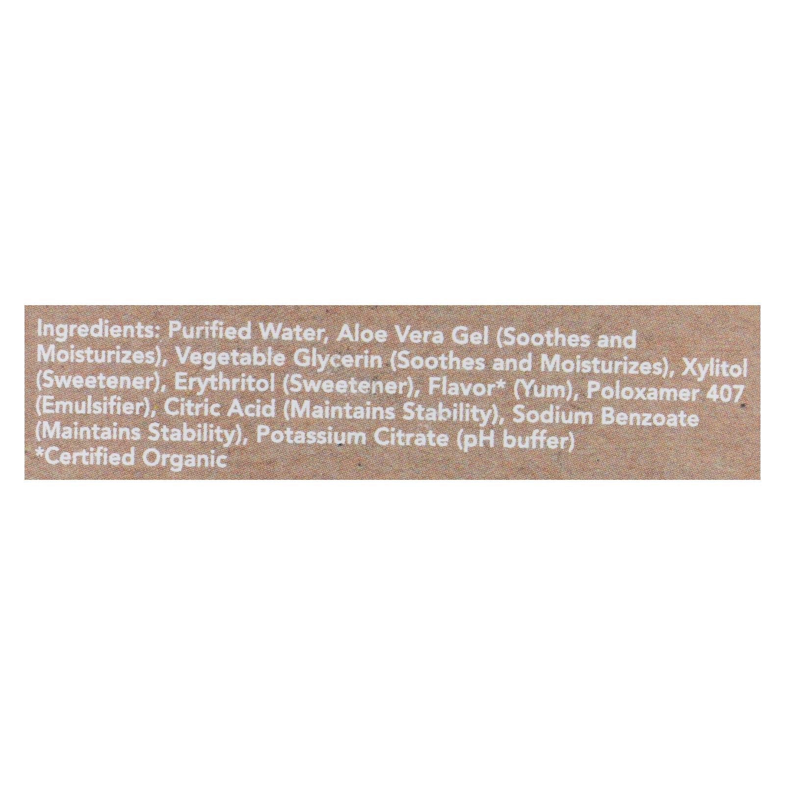 ingredients : purified water;aloe vera gel;soothes and moisturizes;vegetable glycerin;xylitol;sweetener;erythritol;flavor;yum;poloxamer 407;emulsifier;citric acid;maintains stability;sodium benzoate;maintain stability;potassium citrate;ph buffer
