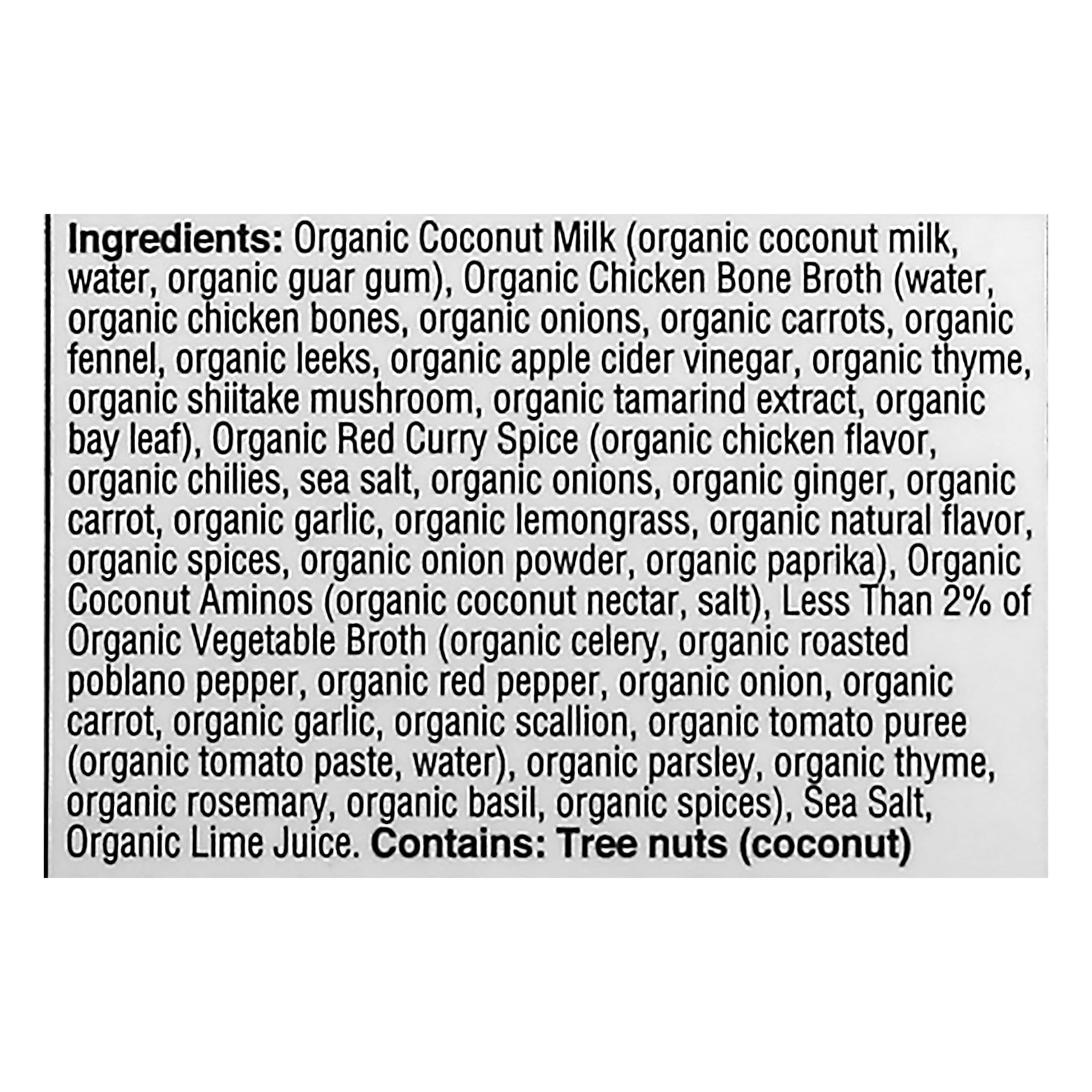 ingredients : organic coconut milk;water;organic guar gum;organic chicken bone broth;organic chicken bones;organic onions;organic carrots;organic fennel;organic leeks;organic apple cider vinegar;organic thyme;organic shiitake mushroom;organic tamarind extract;organic bay leaf;organic red curry spice;organic chicken flavor;organic chilies;sea salt;organic ginger;organic carrot;organic garlic;organic lemongrass;organic natural flavor;organic spices;organic onion powder;organic paprika;organic coconut aminos;org