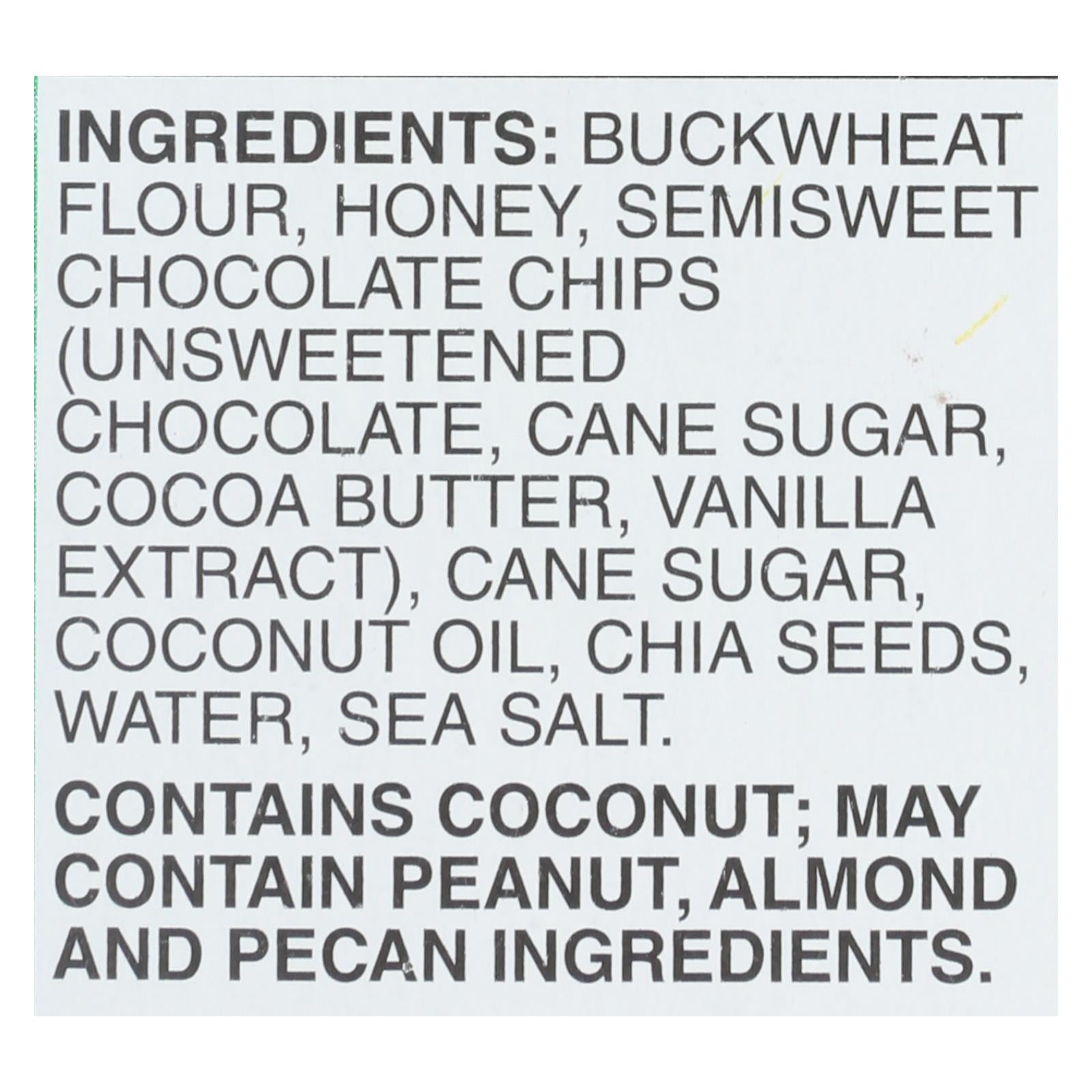ingredients : buckwheat flour;honey;semisweet chocolate chips (unsweetened chocolate, cane sugar, cocoa butter, vanilla extract);cane sugar;coconut oil;chia seeds;water;sea salt
