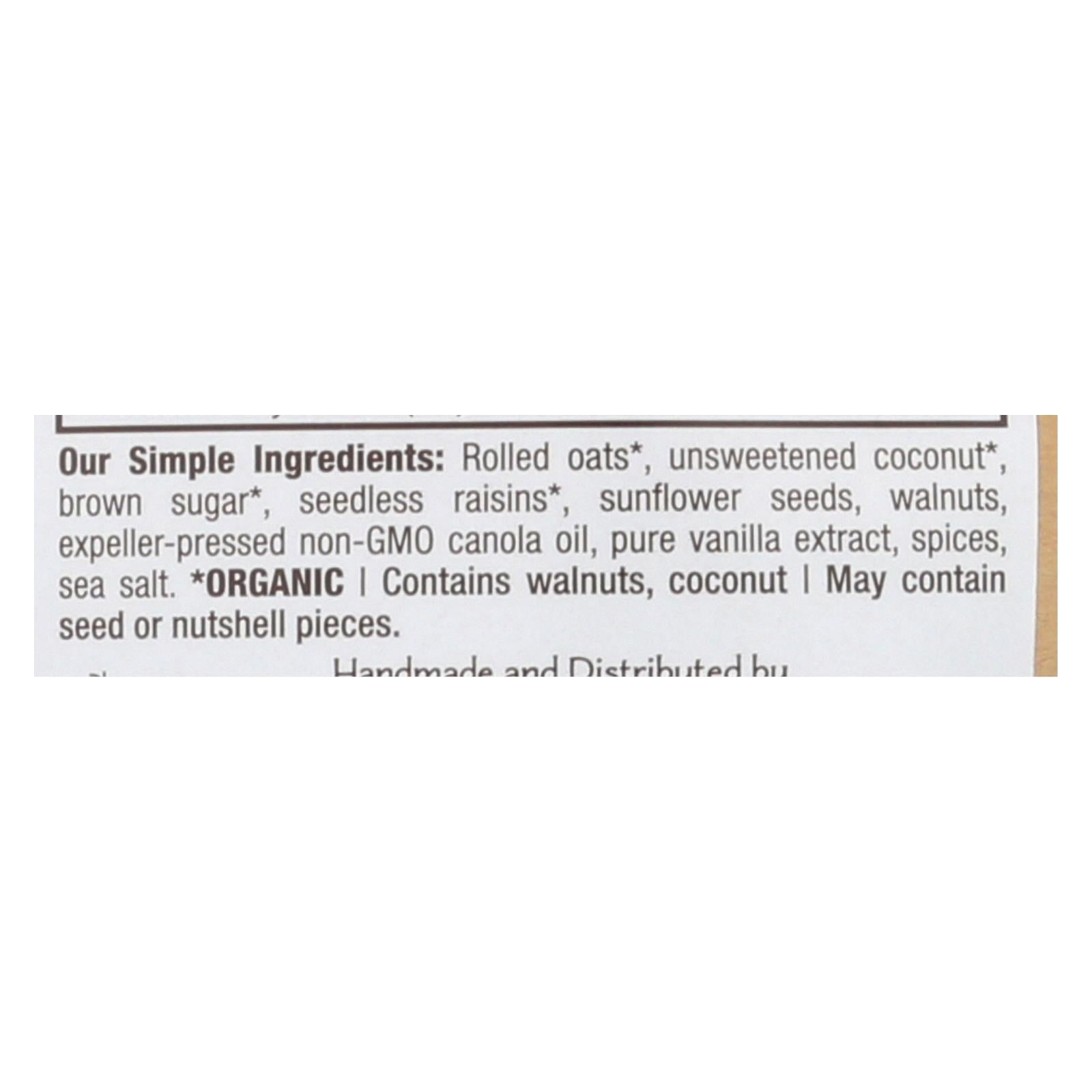 ingredients : organic gluten-free oats;organic brown sugar;expeller-pressed non-gmo canola oil;walnuts;organic unsweetened coconut;organic seedless raisins;organic sunflower seeds;spices;sea salt;pure vanilla extract