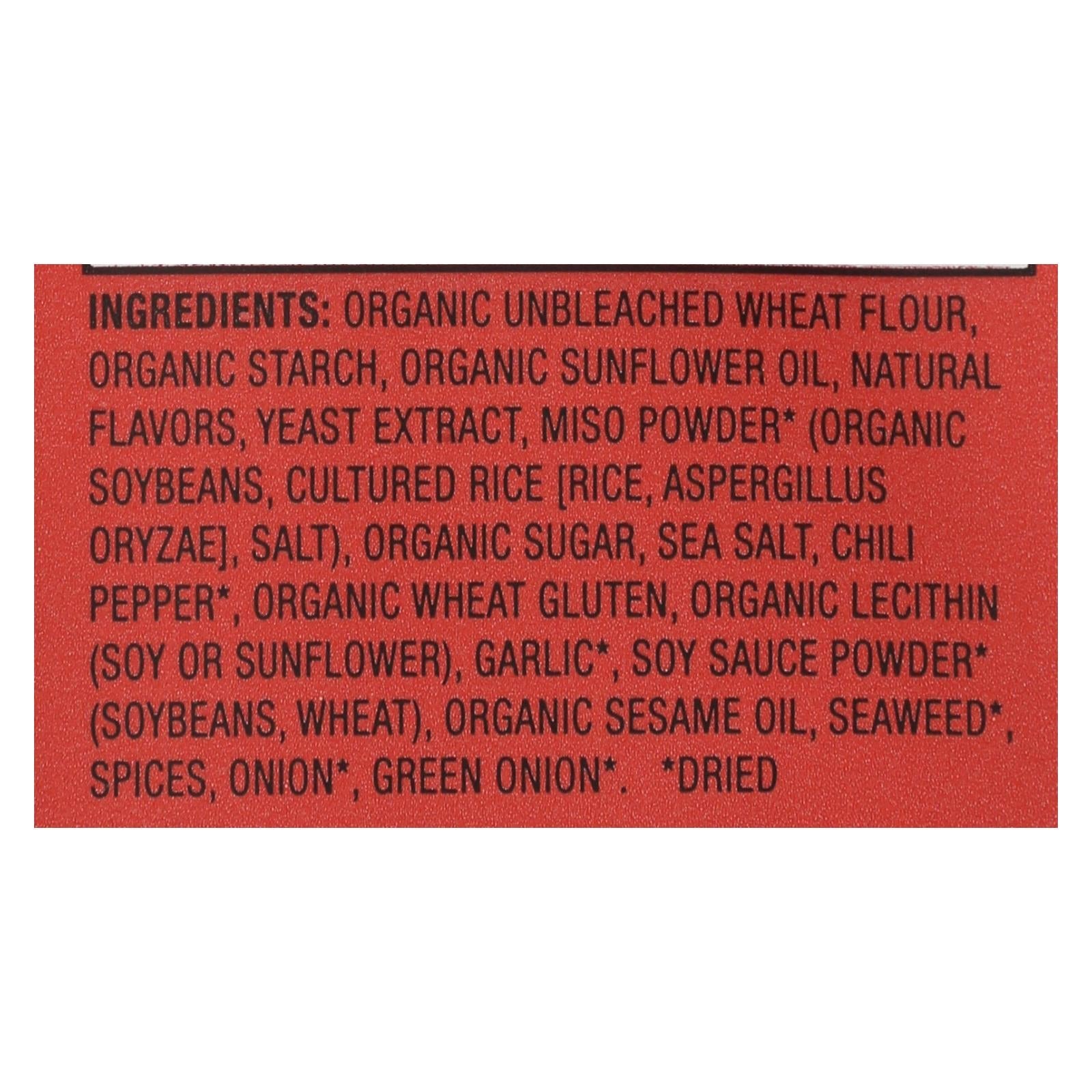 ingredients : organic unbleached wheat flour;organic starch;organic sunflower oil;natural flavors;yeast extract;miso powder;organic soybeans;cultured rice [rice;aspergillus oryzae;salt;organic sugar;sea salt;chili pepper;organic wheat gluten;organic lecithin;soy or sunflower;garlic;soy sauce powder;soybeans;wheat;organic sesame oil;seaweed;spices;onion;green onion