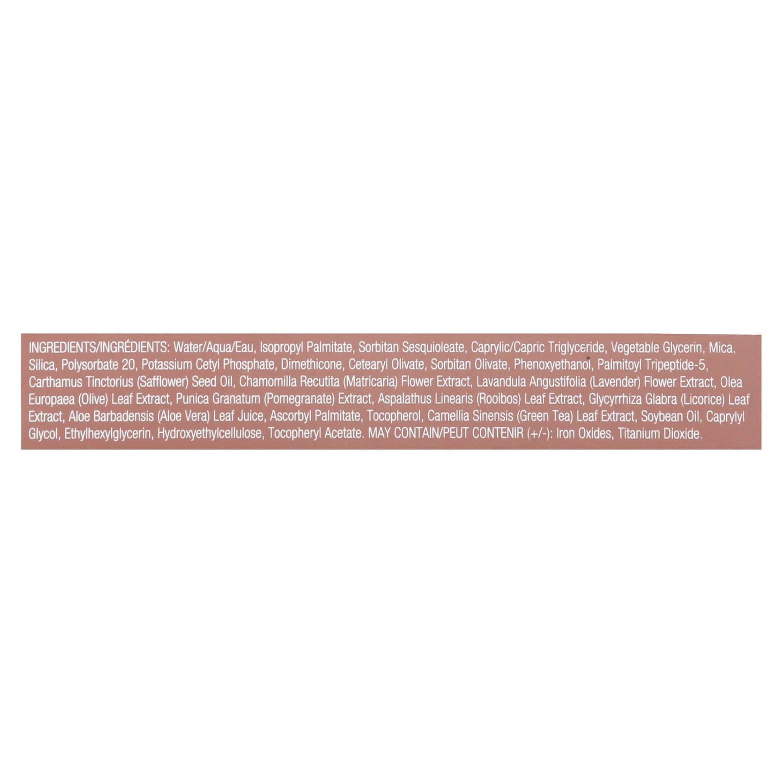 ingredients : water/aqua/eau;isopropyl palmitate;sorbitan sesquioleate;caprylic/capric triglyceride;vegetable glycerin;mica;silica;polysorbate 20;potassium cetyl phosphate;dimethicone;cetearyl olivate;sorbitan olivate;phenoxyethanol;palmitoyl tripeptide-5;carthamus tinctorius (safflower) seed oil;chamomilla recutita (matricaria) flower extract;lavandula angustifolia (lavender) flower extract;olea europaea (olive) leaf extract;punica granatum (pomegranate) extract;aspalathus linearis (rooibos) leaf extract;gly