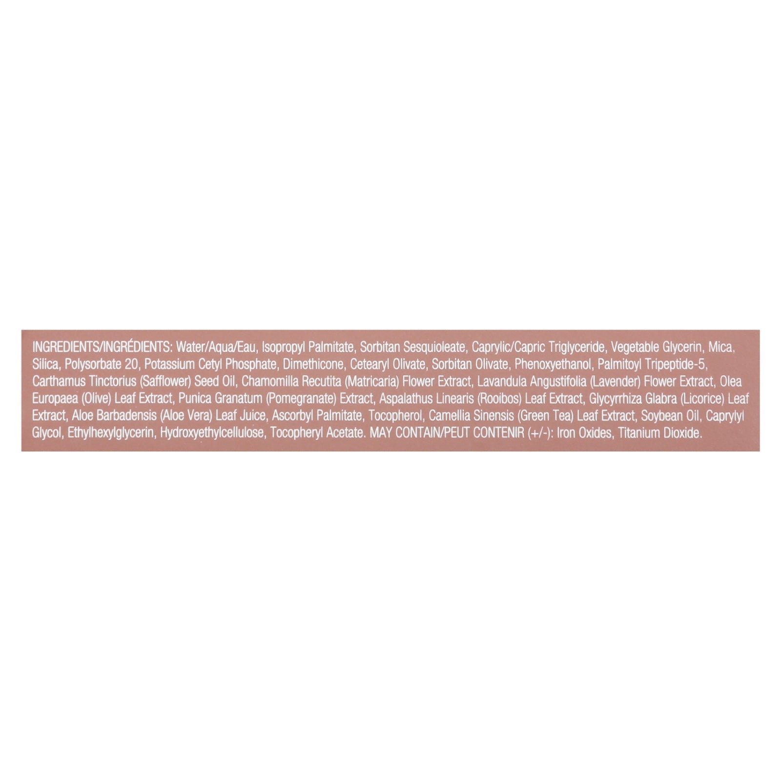 ingredients : water/aqua/eau;isopropyl palmitate;sorbitan sesquioleate;caprylic/capric triglyceride;vegetable glycerin;mica;silica;polysorbate 20;potassium cetyl phosphate;dimethicone;cetearyl olivate;sorbitan olivate;phenoxyethanol;palmitoyl tripeptide-5;carthamus tinctorius (safflower) seed oil;chamomilla recutita (matricaria) flower extract;lavandula angustifolia (lavender) flower extract;olea europaea (olive) leaf extract;punica granatum (pomegranate) extract;aspalathus linearis (rooibos) leaf extract;gly