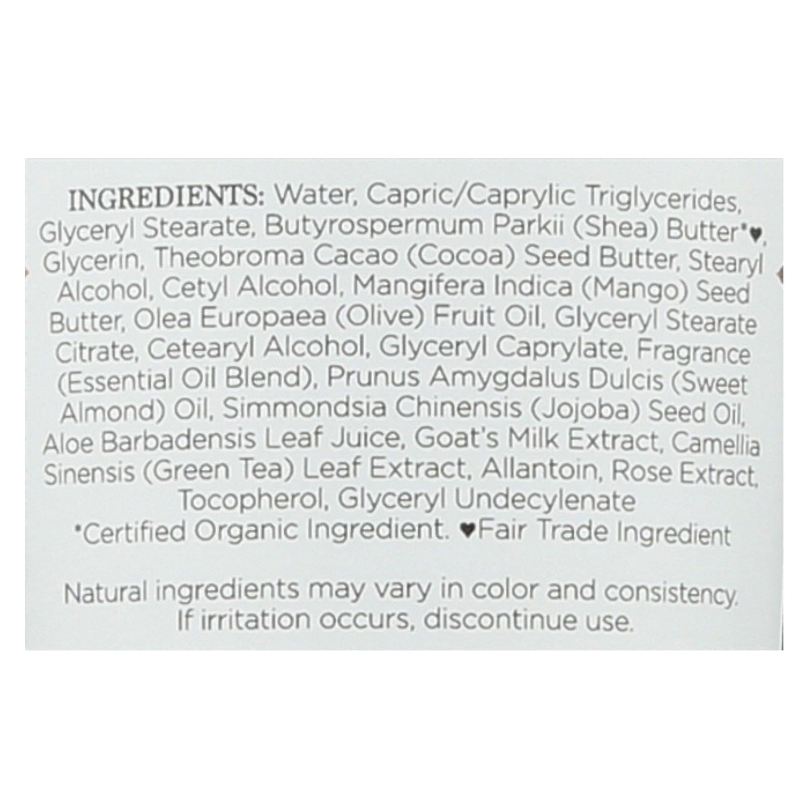 ingredients : water;capric/caprylic triglycerides;glyceryl stearate;butyrospermum parkii;shea;butter*♥;glycerin;theobroma cacao;cocoa;seed butter;stearyl alcohol;cetyl alcohol;mangifera indica;mango;olea europaea;olive;fruit oil;glyceryl stearate citrate;cetearyl alcohol;glyceryl caprylate;fragrance;essential oil blend;prunus amygdalus dulcis;sweet almond;oil;simmondsia chinensis;jojoba;seed oil;aloe barbadensis leaf juice;goat's milk extract;camellia sinensis;green tea;leaf extract;allantoin;rose extract;toc