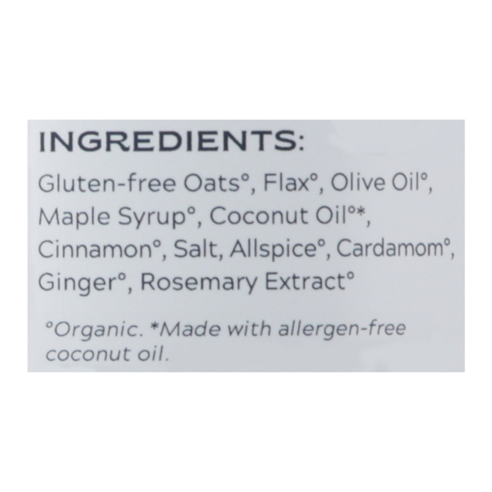 ingredients : gluten-free oats°;olive oil°;maple syrup°;coconut oil°;cinnamon°;rosemary extract°;salt;allspice°;cardamom°;ginger°