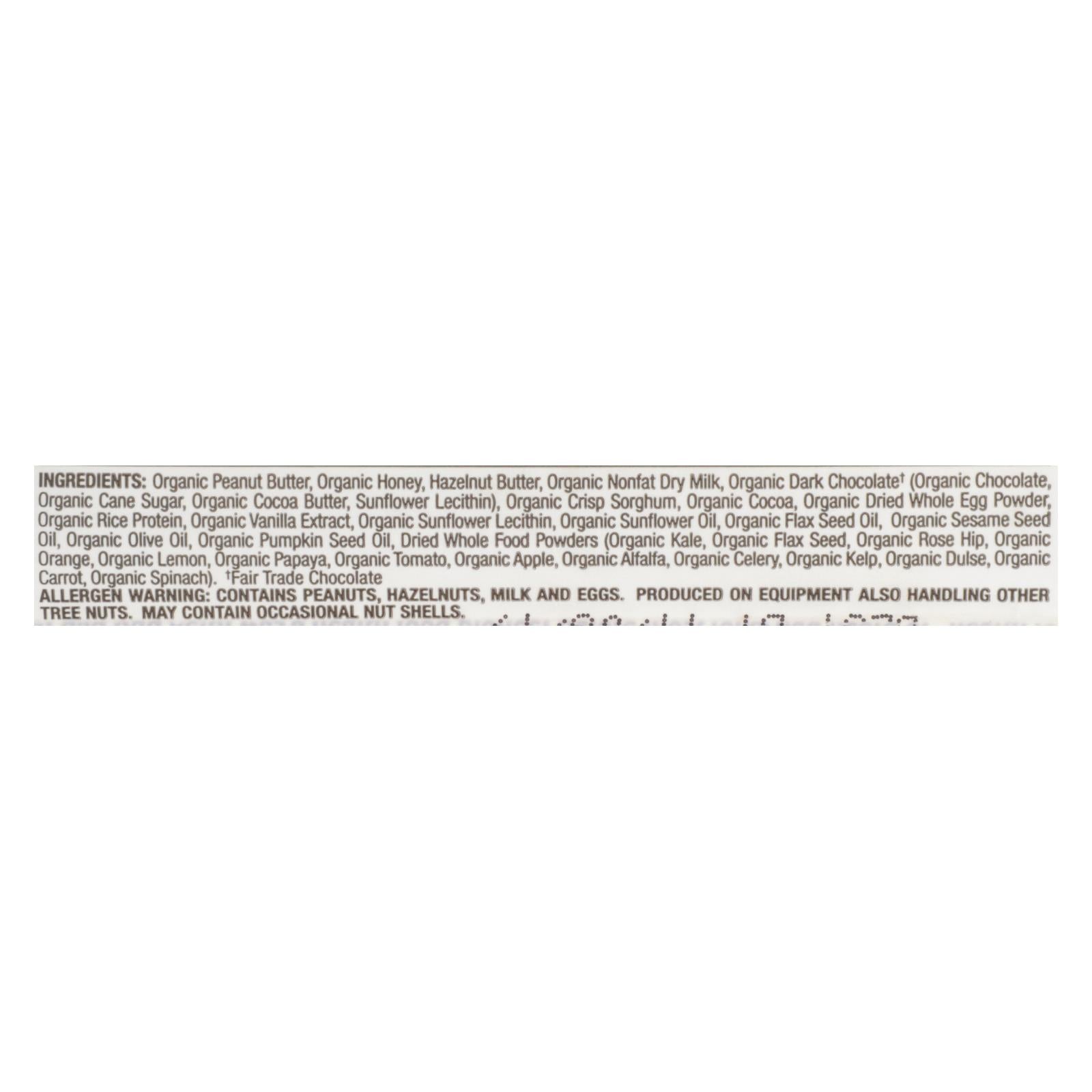 ingredients : peanut butter;honey;hazelnut butter;nonfat dry milk;dark chocolate* (chocolate*, cane sugar*, cocoa butter*, sunflower lecithin);crisp sorghum;cocoa;dried whole egg powder;rice protein;vanilla extract;dried whole food powders (kale*, flax seed*, rose hip*, orange*, lemon*, papaya*, tomato*, apple*, alfalfa*, celery*, kelp*, dulse*, carrot*, spinach*);flax seed oil;sunflower oil;sesame seed oil;olive oil;pumpkin seed oil