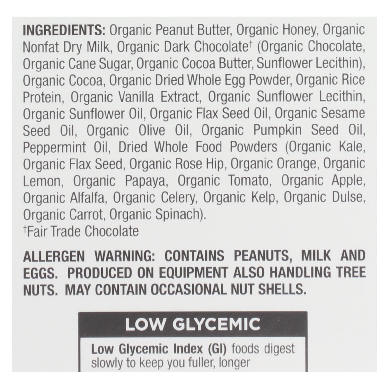 ingredients : peanut butter;honey;nonfat dry milk;dark chocolate* (chocolate*, cane sugar*, cocoa butter, sunflower lecithin);cocoa;dried whole egg powder;rice protein;vanilla extract;dried whole food powders (kale*, flax seed*, rose hip*, orange*, lemon*, papaya*, tomato*, apple*, alfalfa*, celery*, kelp*, dulse*, carrot*, spinach*);flax seed oil;sunflower oil;sesame seed oil;olive oil;pumpkin seed oil;peppermint oil