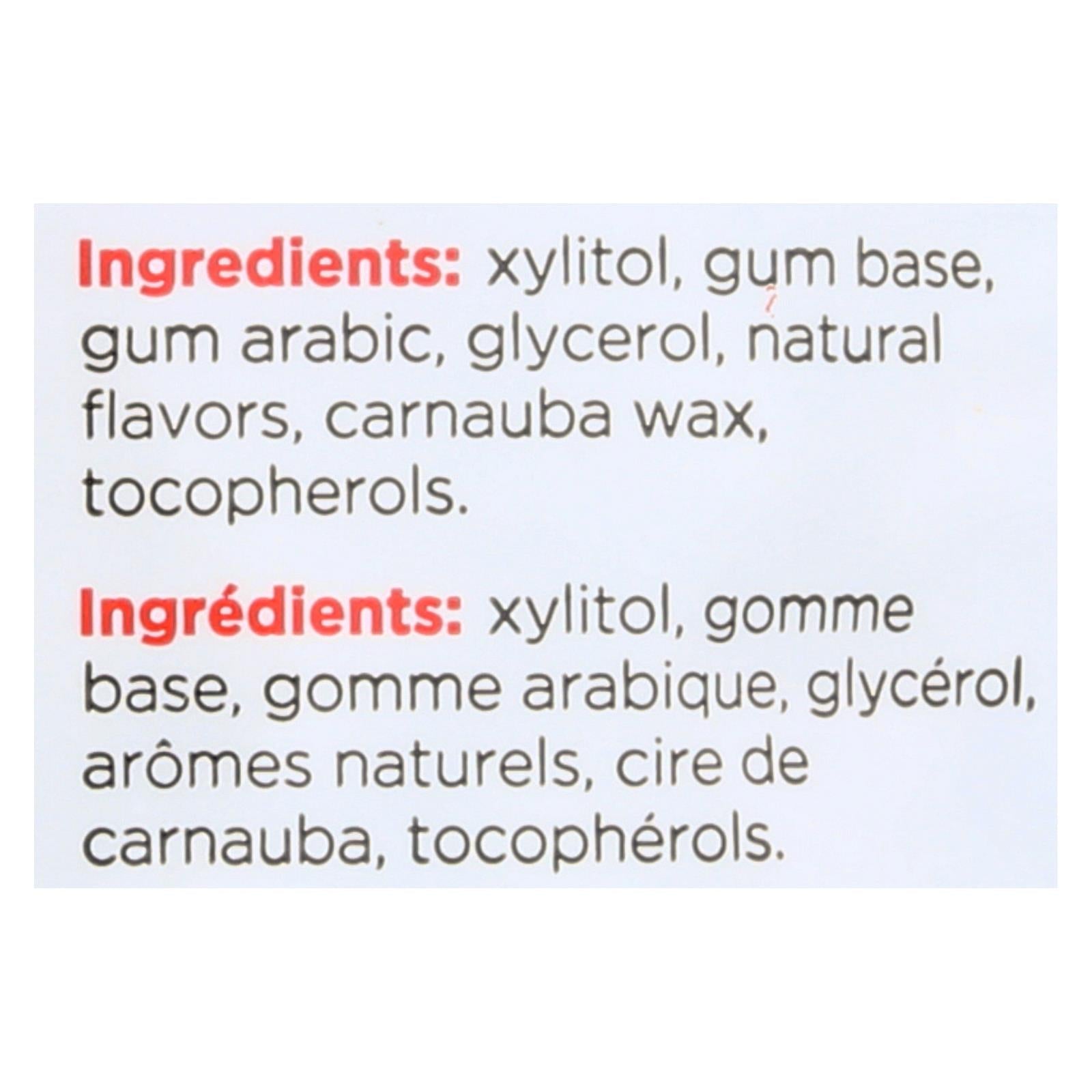 ingredients : xylitol;gum base;gum arabic;glycerol;natural flavors;carnauba wax;tocopherols