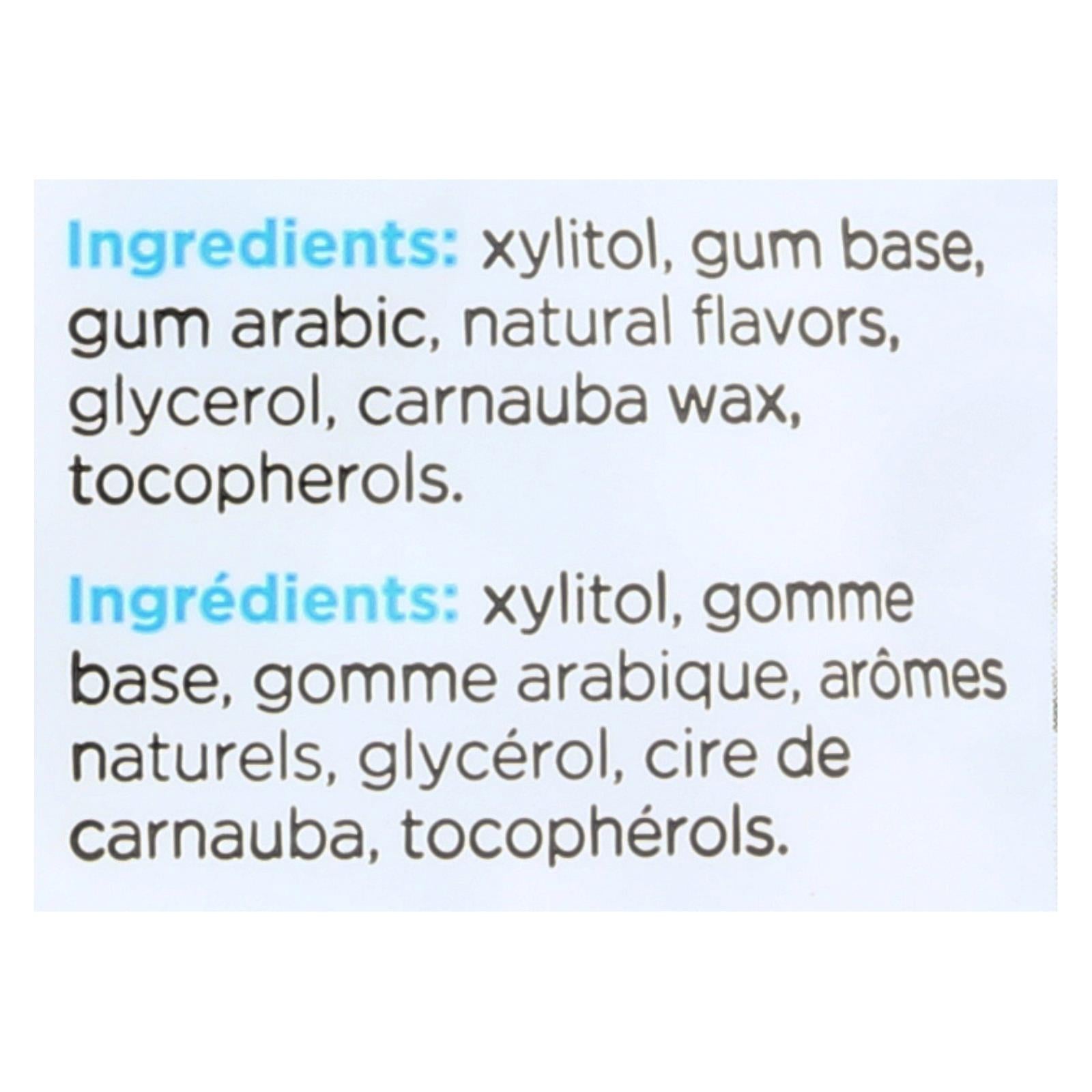 ingredients : xylitol;gum base;gum arabic;natural flavors;glycerol;carnauba wax;tocopherols