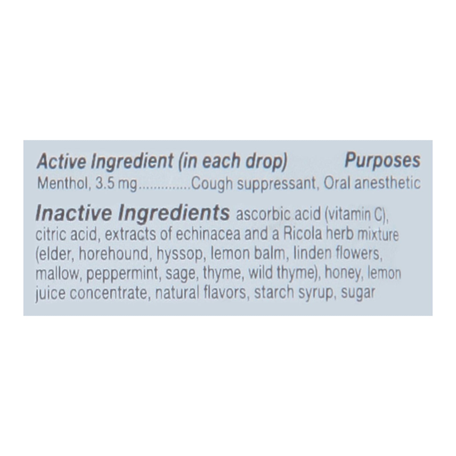 ingredients : (in each drop) menthol;3;5 mg purpose cough suppressant;oral anesthetic;ascorbic acid (vitamin c);citric acid;extracts of echinacea and a ricola herb mixture (elder, horehound, hyssop, lemon balm, linden flowers, mallow, peppermint, sage, thyme, wild thyme);honey;lemon juice concentrate;natural flavors;starch syrup;sugar