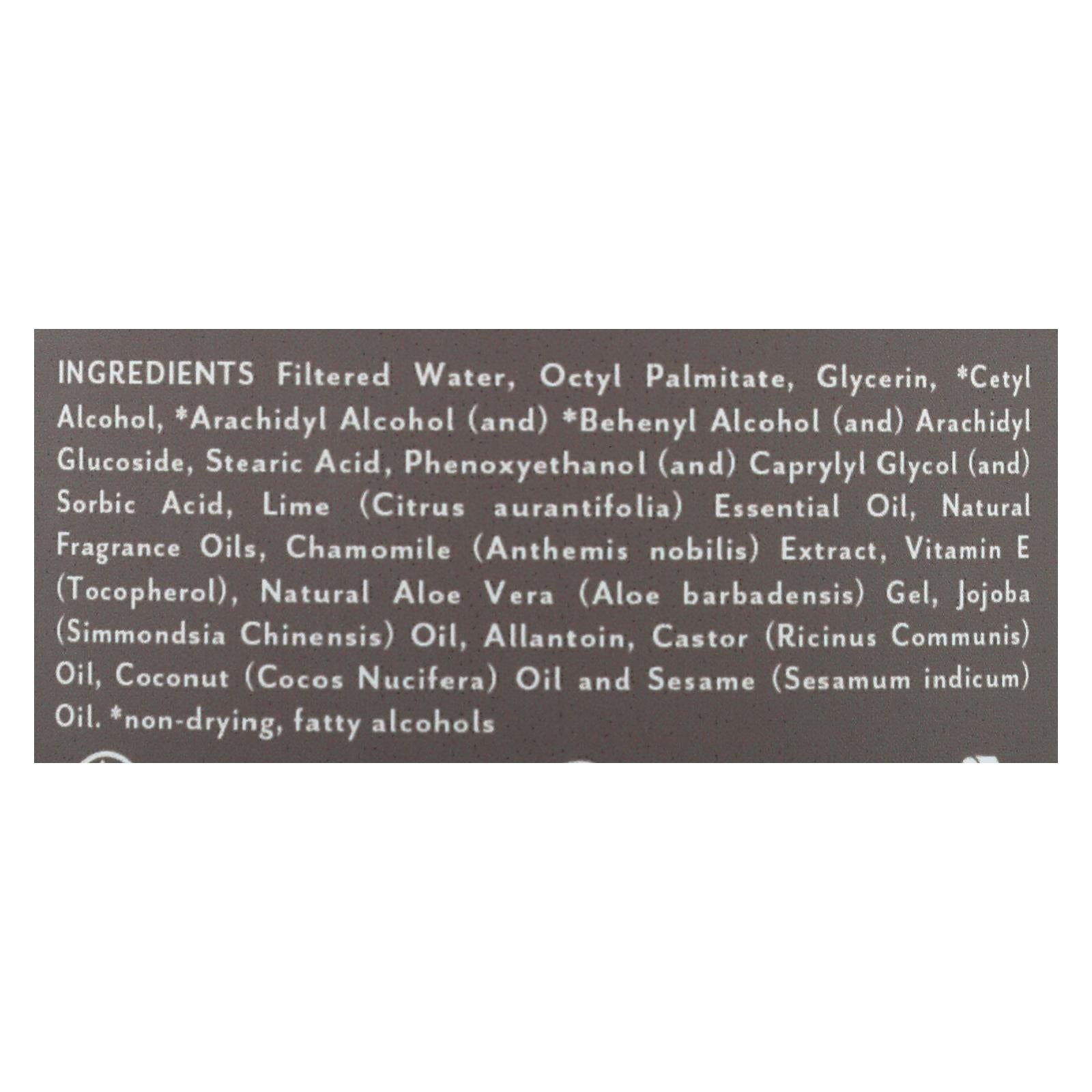 ingredients : filtered water;octyl palmitate;glycerin;cetyl alcohol;arachidyl alcohol;and;behenyl alcohol;arachidyl glucoside;stearic acid;phenoxyethanol;caprylyl glycol;sorbic acid;lime;citrus aurantifolia;essential oil;natural fragrance oils;chamomile;anthemis nobilis;extract;vitamin e;tocopherol;natural aloe vera;aloe barbadensis;gel;jojoba;simmondsia chinensis;oil;allantoin;castor;ricinus communis;coconut;cocos nucifera;oil and sesame;sesamum indicum