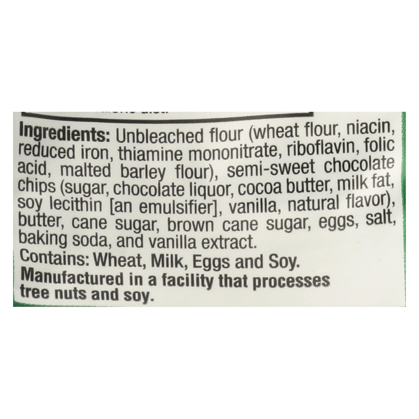 ingredients : unbleached flour (wheat flour, niacin, reduced iron, thiamine mononitrate, riboflavin, folic acid, malted barley flour);semi-sweet chocolate chips (sugar, chocolate liquor, cocoa butter, milk fat, soy lecithin [an emulsifier], vanilla, natural flavor);butter;cane sugar;brown cane sugar;eggs;salt;baking soda;and vanilla extract