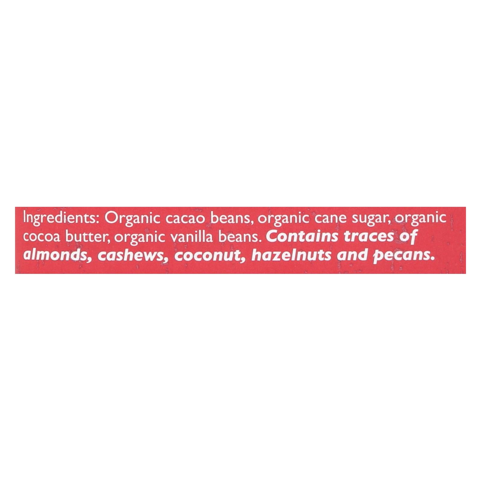 ingredients : organic cacao beans;organic cane sugar;organic cocoa butter;organic vanilla beans
