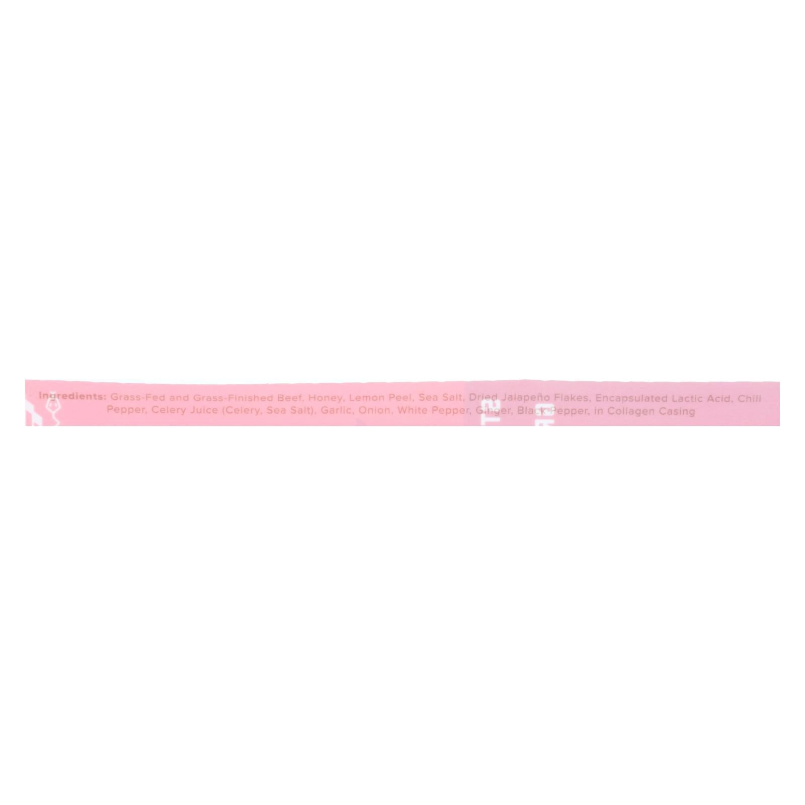 ingredients : grass-fed and grass-finished beef;honey;lemon peel;sea salt;dried jalapeno flakes;encapsulated lactic acid;chili pepper;celery juice (celery, sea salt);garlic;onion;white pepper;ginger;black pepper;in collagen casing