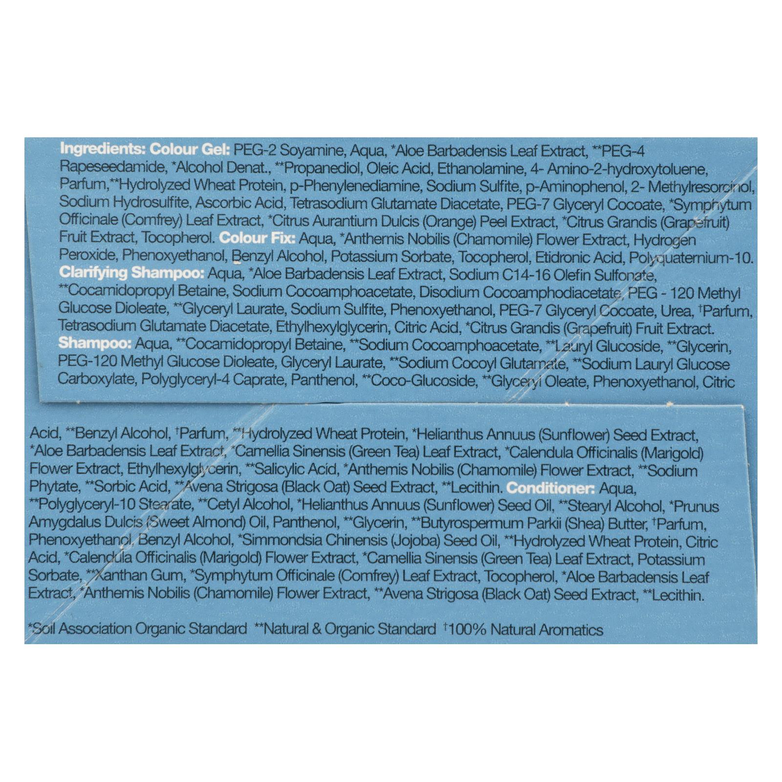 ingredients : colour gel: peg-2 soyamine;aqua;aloe barbadensis leaf extract;peg-4 rapeseedamide;alcohol denat;propanediol;oleic acid;ethanolamine;4- amino-2-hydroxytoluene;parfum;hydrolyzed wheat protein;p-phenylenediamine;sodium sulfite;p-aminophenol;2- methylresorcinol;sodium hydrosulfite;ascorbic acid;tetrasodium glutamate diacetate;peg-7 glyceryl cocoate;symphytum officinale;comfrey;leaf extract;citrus aurantium dulcis;orange;peel extract;citrus grandis;grapefruit;fruit extract;tocopherol. Colour fix: aqu