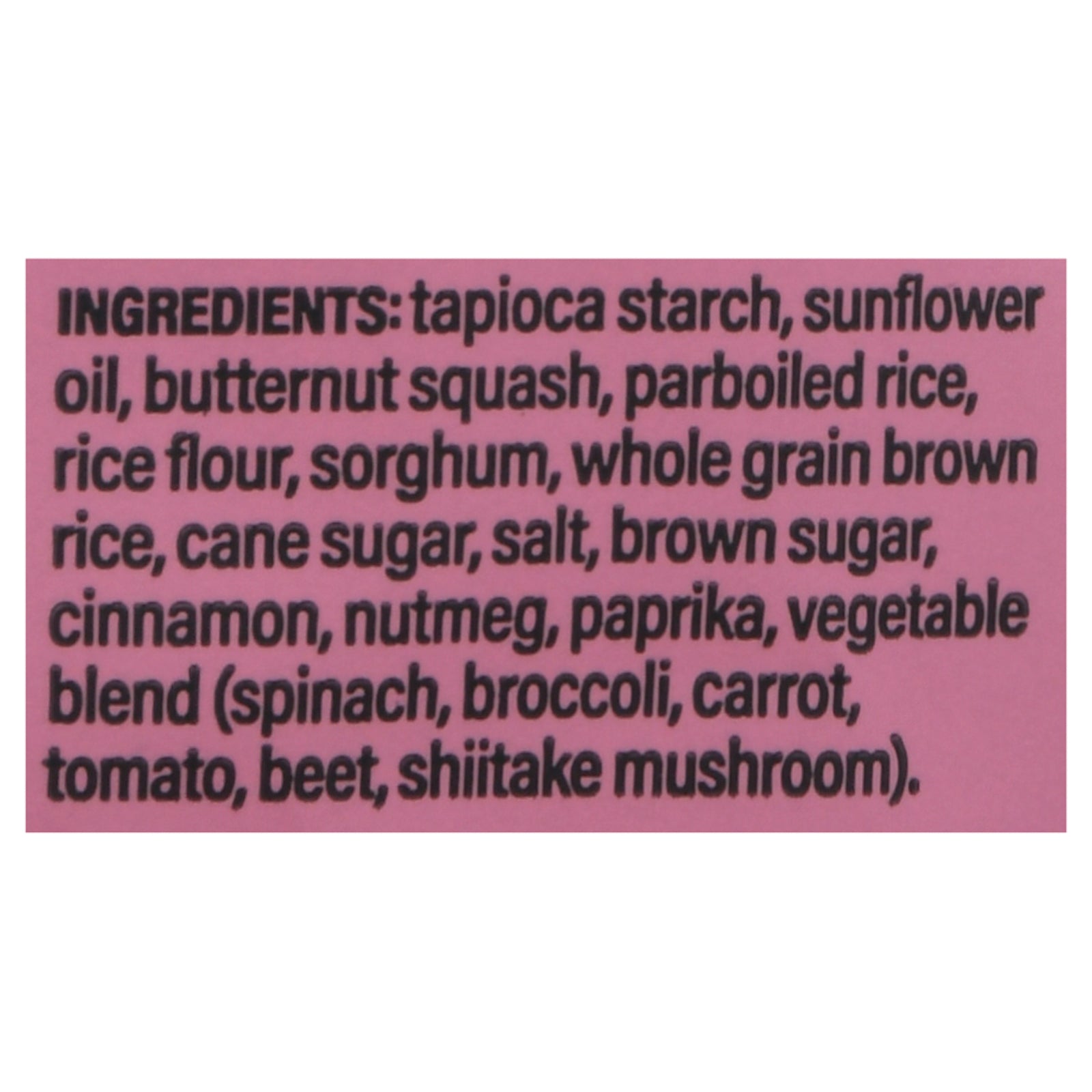 ingredients : tapioca starch;sunflower oil;butternut squash;parboiled rice;rice flour;sorghum;whole grain brown rice;cane sugar;salt;brown sugar;cinnamon;nutmeg;paprika;vegetable blend (spinach, broccoli, carrot, tomato, beet, shiitake mushroom)