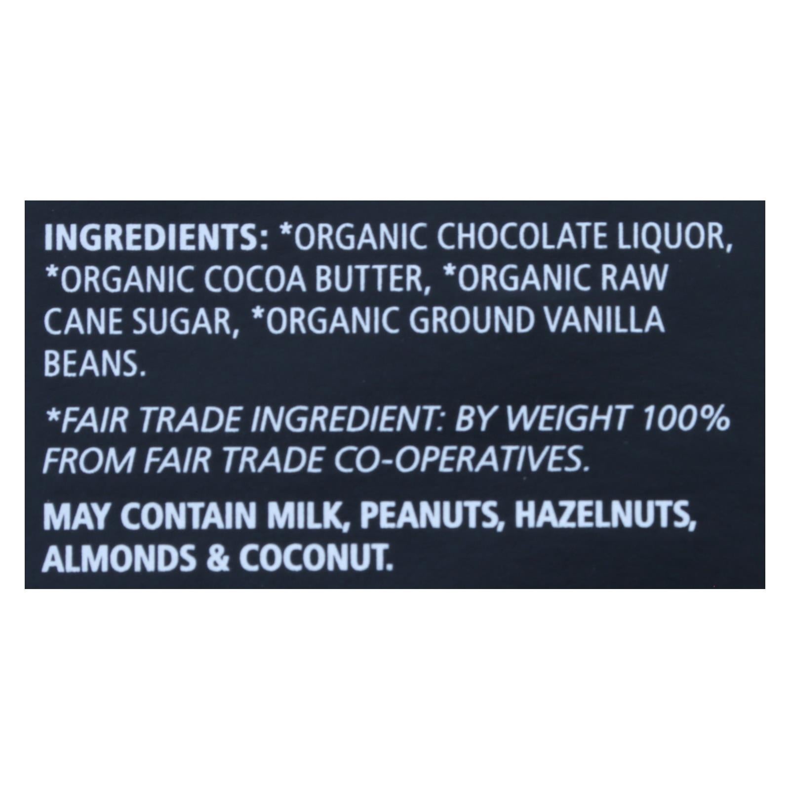 ingredients : organic chocolate liquor;organic cocoa butter;organic raw cane sugar;organic ground vanilla beans
