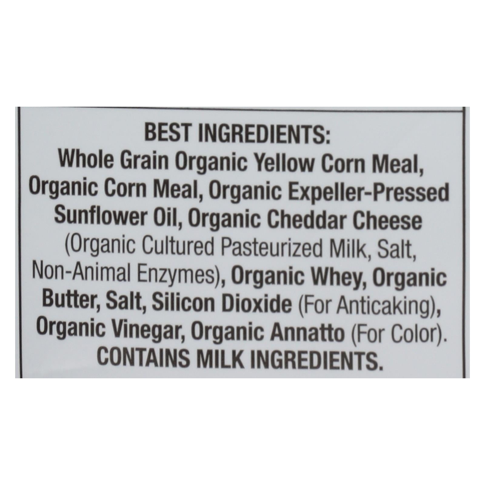 ingredients : whole grain organic yellow corn meal;organic corn meal;organic expeller-pressed sunflower oil;organic cheddar cheese;organic cultured pasteurized milk;salt;non-animal enzymes;organic whey;organic butter;silicon dioxide;for anticaking;organic vinegar;organic annatto;for color