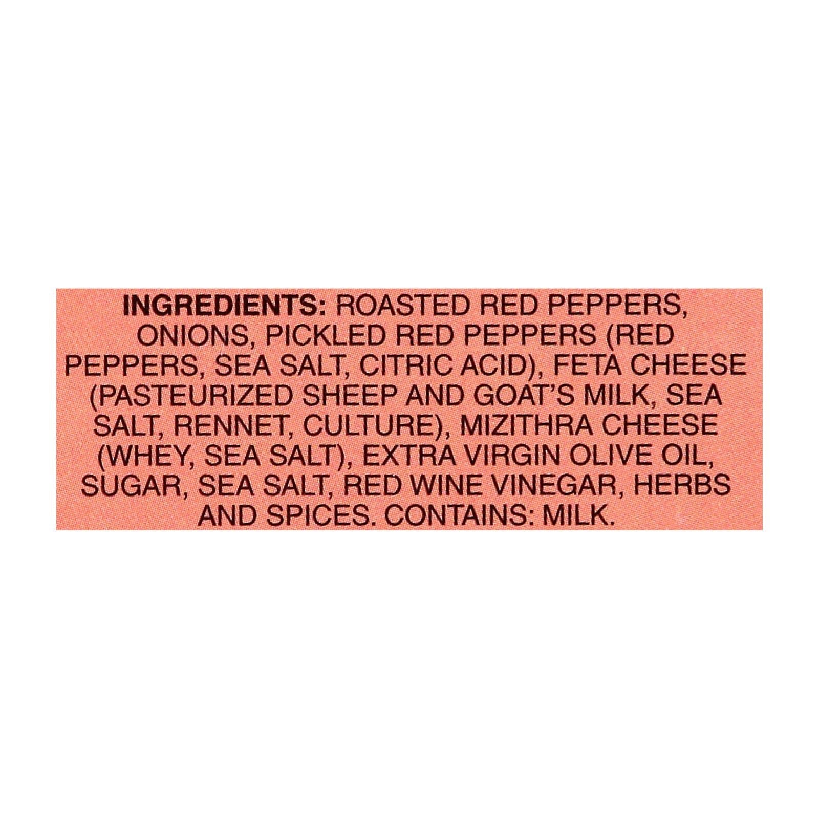 ingredients : roasted red peppers;onions;pickled red peppers (red peppers, sea salt, citric acid);feta cheese (pasteurized sheep and goat's milk, sea salt, rennet, culture);mizithra cheese (milk whey, salt);extra virgin olive oil;sugar;sea salt;red wine vinegar;herbs and spices