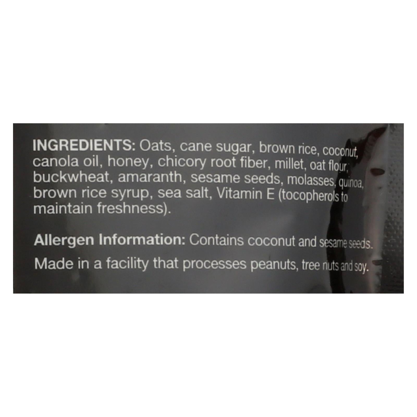 ingredients : oats;cane sugar;brown rice;coconut;canola oil;honey;chicory root fiber;millet;oat flour;buckwheat;amaranth;seasame seeds;molasses;quinoa;brown rice syrup;sea salt;vitamin e;tocopherols to maintain freshness